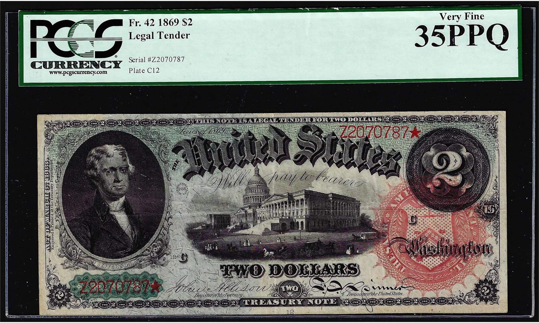 One 1869 $2 Rainbow Legal Tender Note Fr.42 PCGS Very Fine 35PPQ. PCGS Graded.