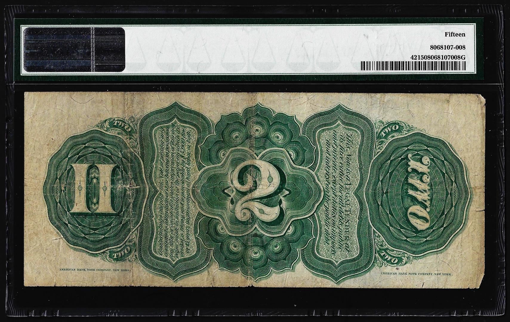 One 1869 $2 Rainbow Legal Tender Note Fr.42 PMG Choice Fine 15. PMG Certified.