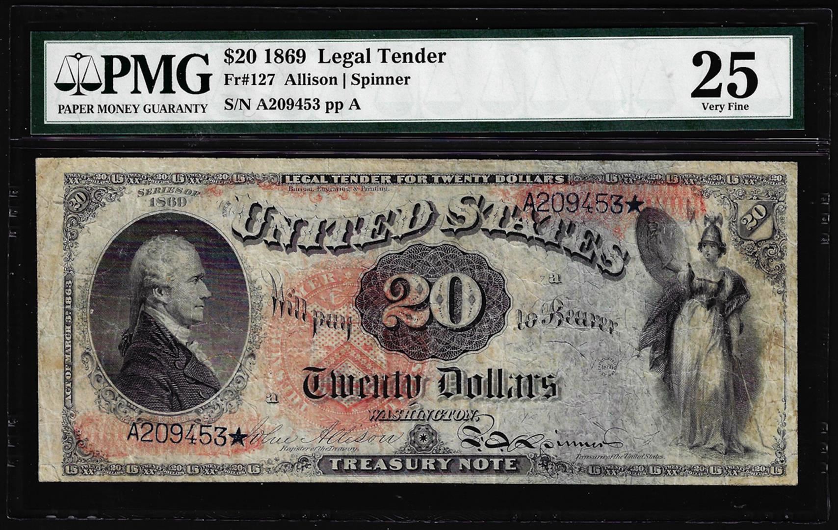 One 1869 $20 Legal Tender Note Fr.127 PMG Very Fine 25. PMG Certified.