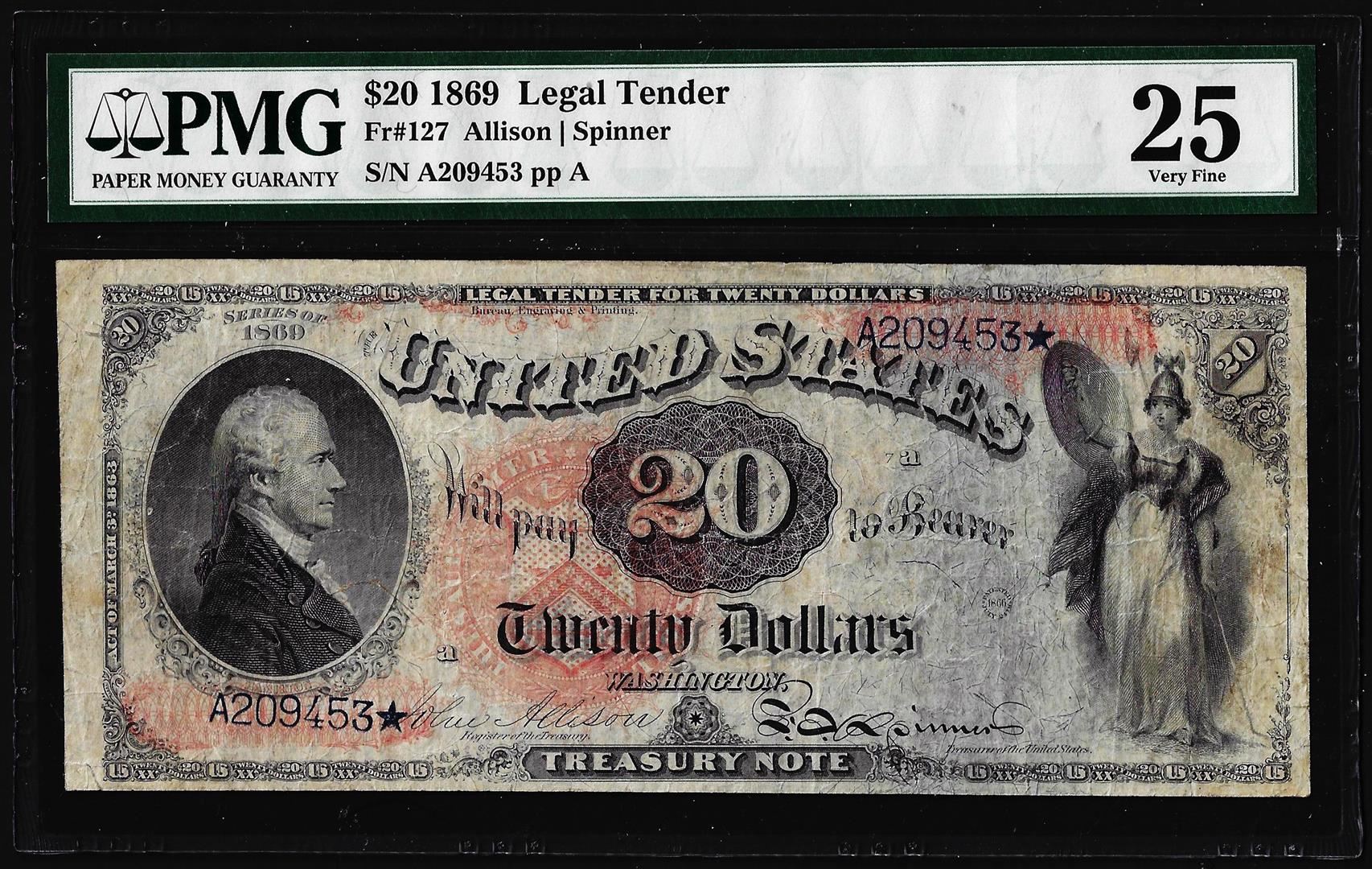 One 1869 $20 Legal Tender Note Fr.127 PMG Very Fine 25. PMG Certified.
