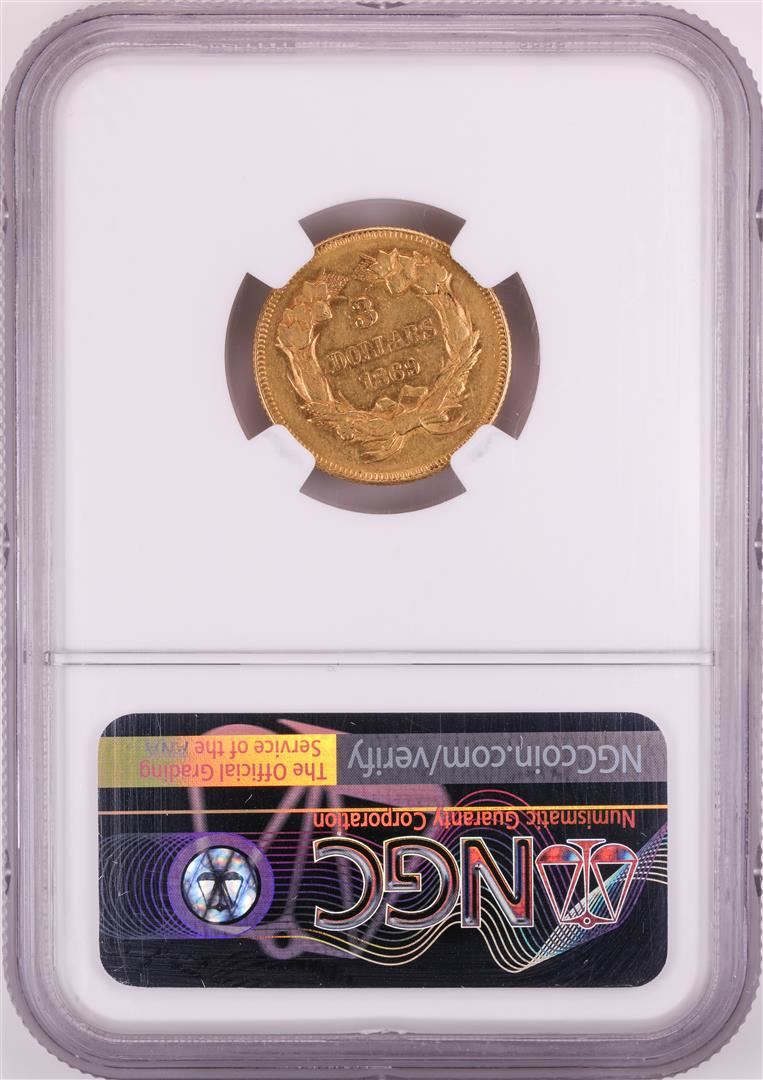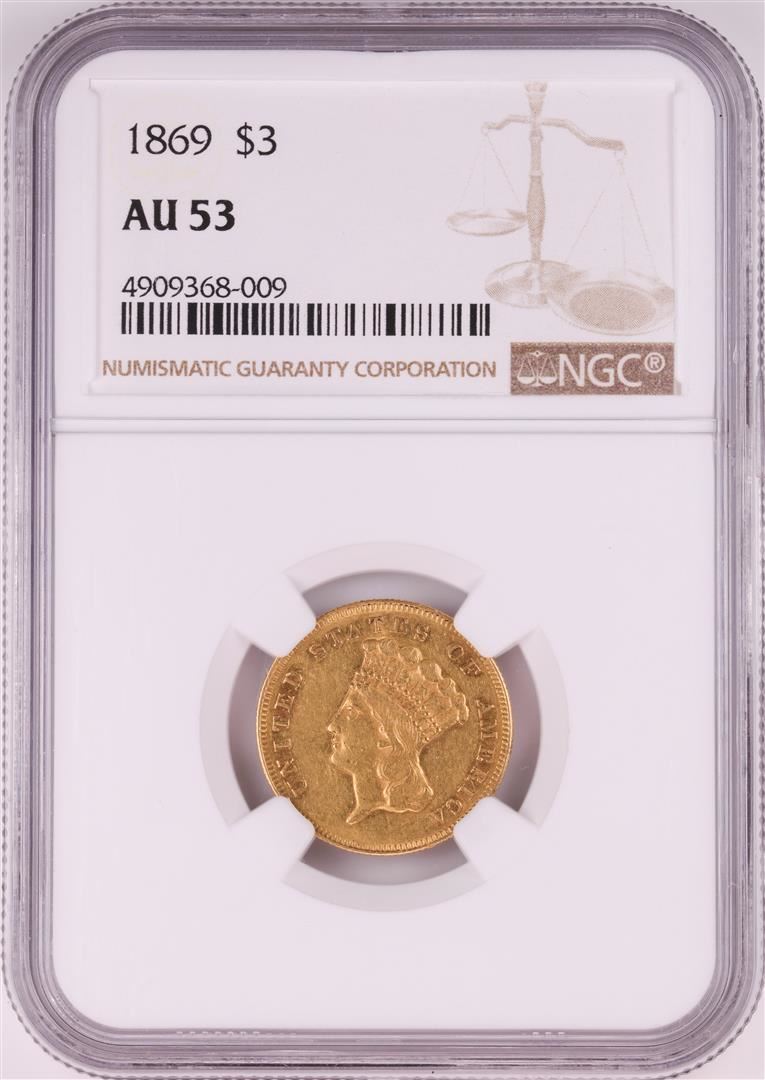 One 1869 $3 Indian Princess Head Gold Coin NGC AU53. NGC Certified.