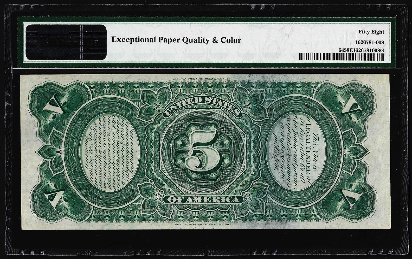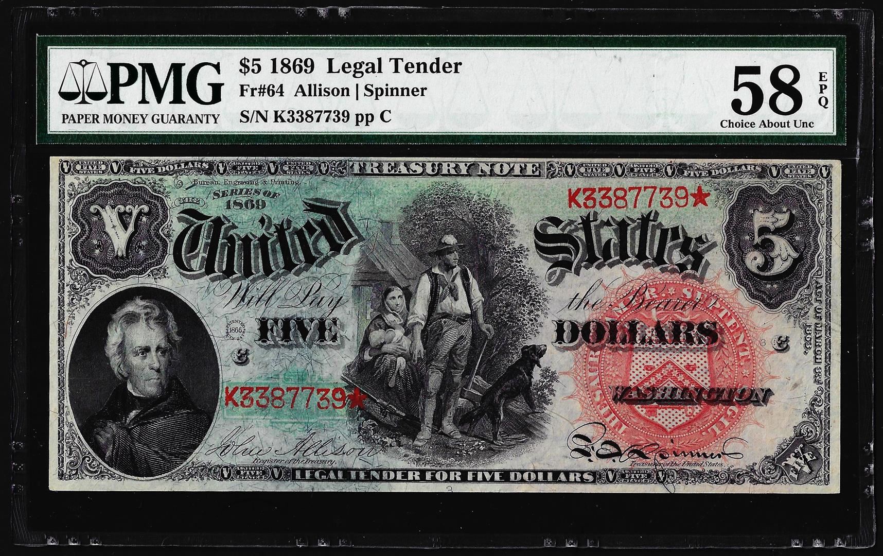 One 1869 $5 Rainbow Legal Tender Note Fr.64 PMG Choice About Uncirculated 58EPQ Color. PMG Certified.
