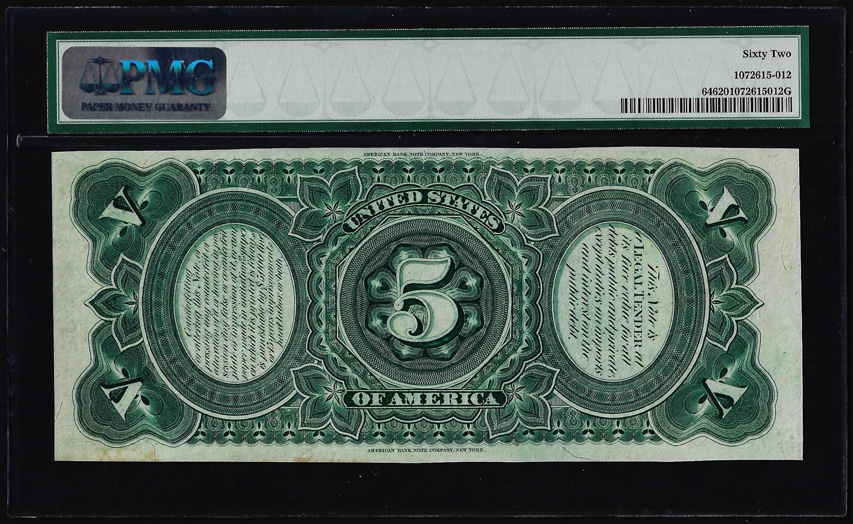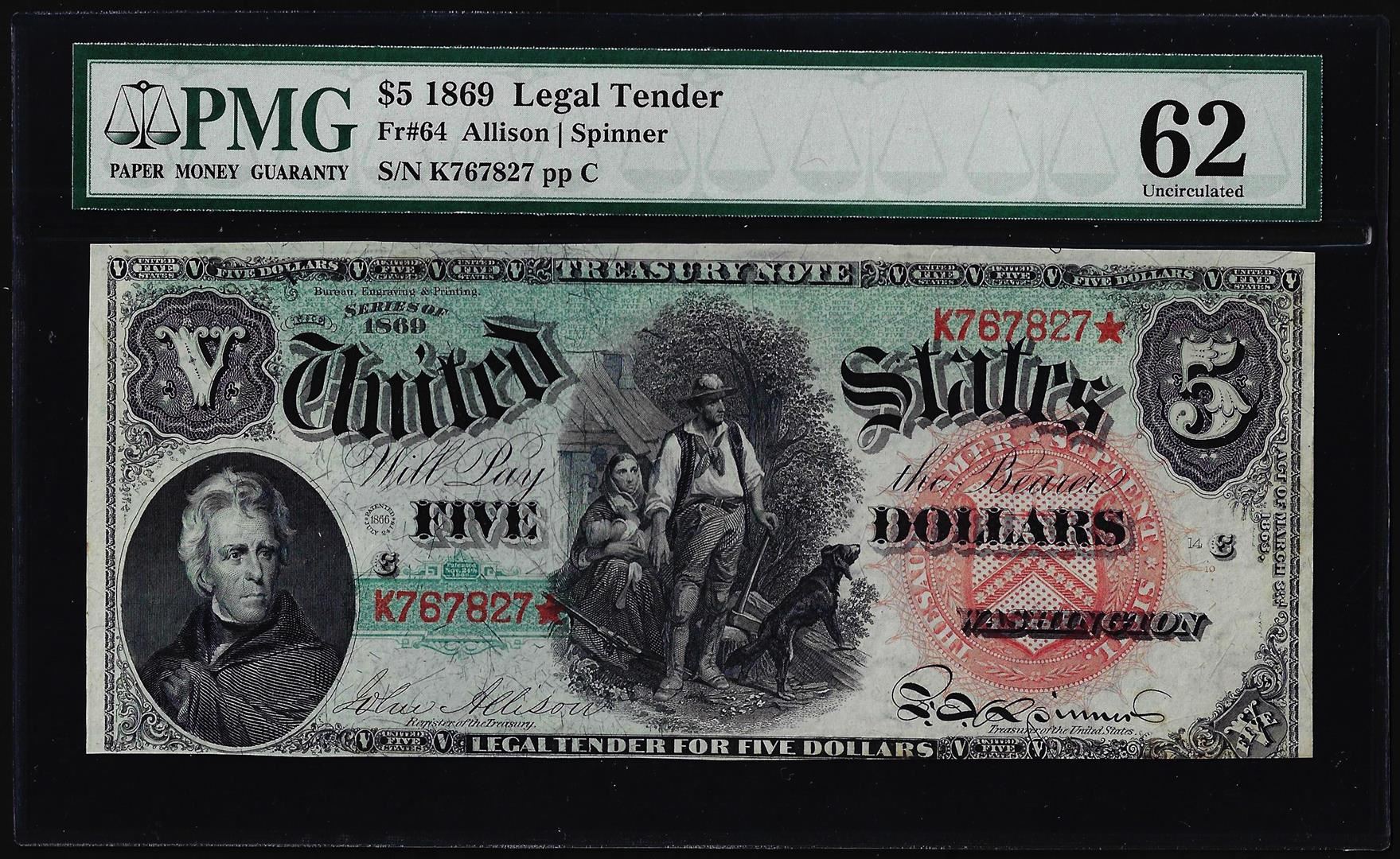 One 1869 $5 Rainbow Woodchopper Legal Tender Note Fr.64 PMG Choice Uncirculated 62. PMG Certified.