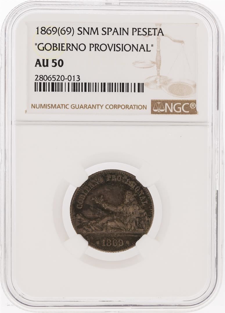 One 1869(69) SNM Spain Peseta "Gobierno Provisional" Coin NGC AU50. NGC Certified.