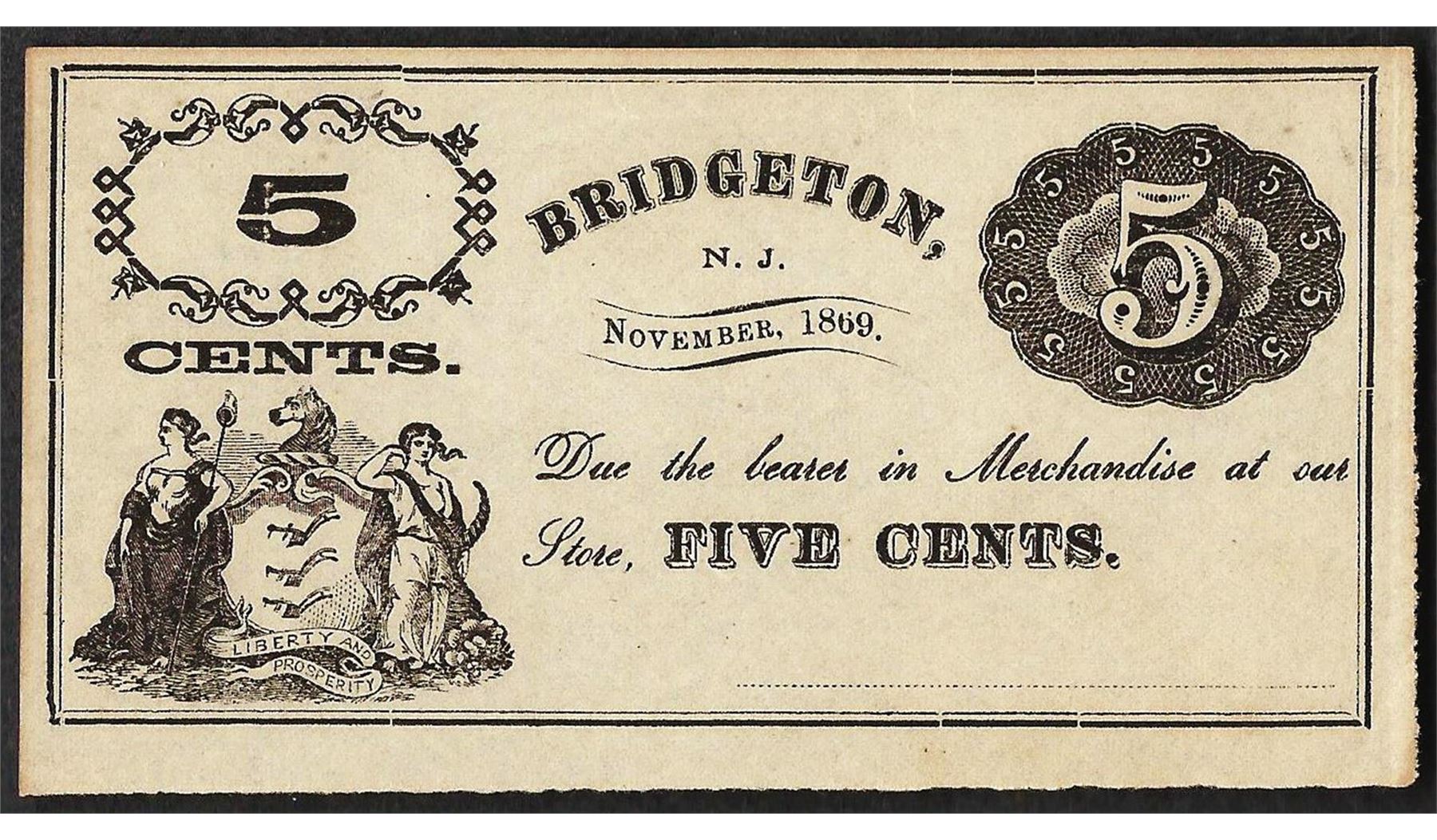 1869 Five Cents Bridgeton, NJ Obsolete Note