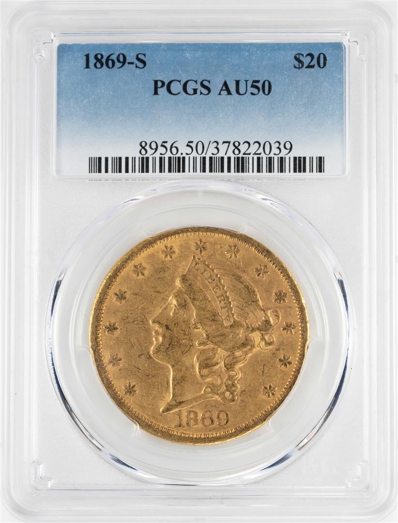 One 1869-S $20 Liberty Head Double Eagle Gold Coin PCGS AU50. PCGS Graded.