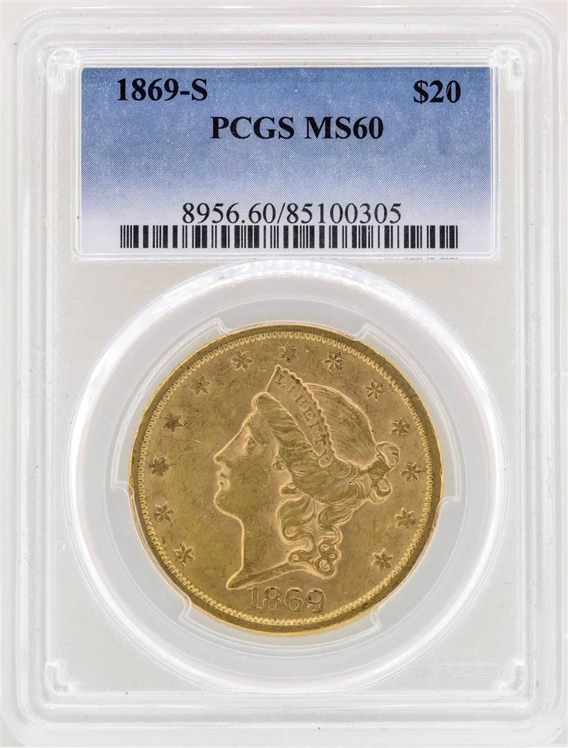 One 1869-S $20 Liberty Head Double Eagle Gold Coin PCGS MS60. PCGS Graded.