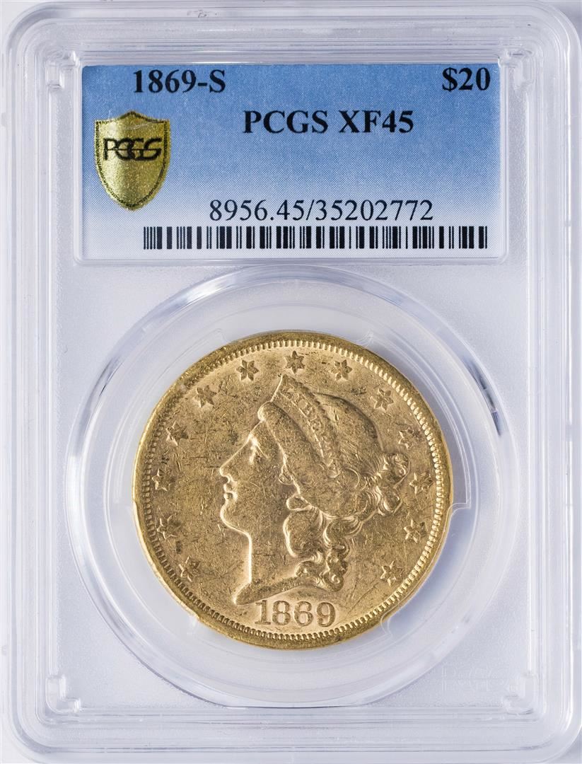 One 1869-S $20 Liberty Head Double Eagle Gold Coin PCGS XF45. PCGS Graded.