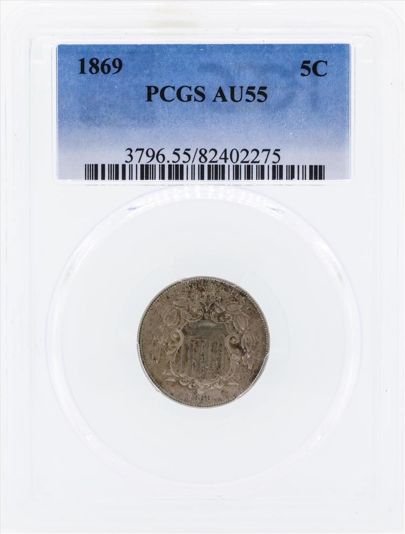 One 1869 Shield Nickel Coin PCGS AU55. PCGS Graded.