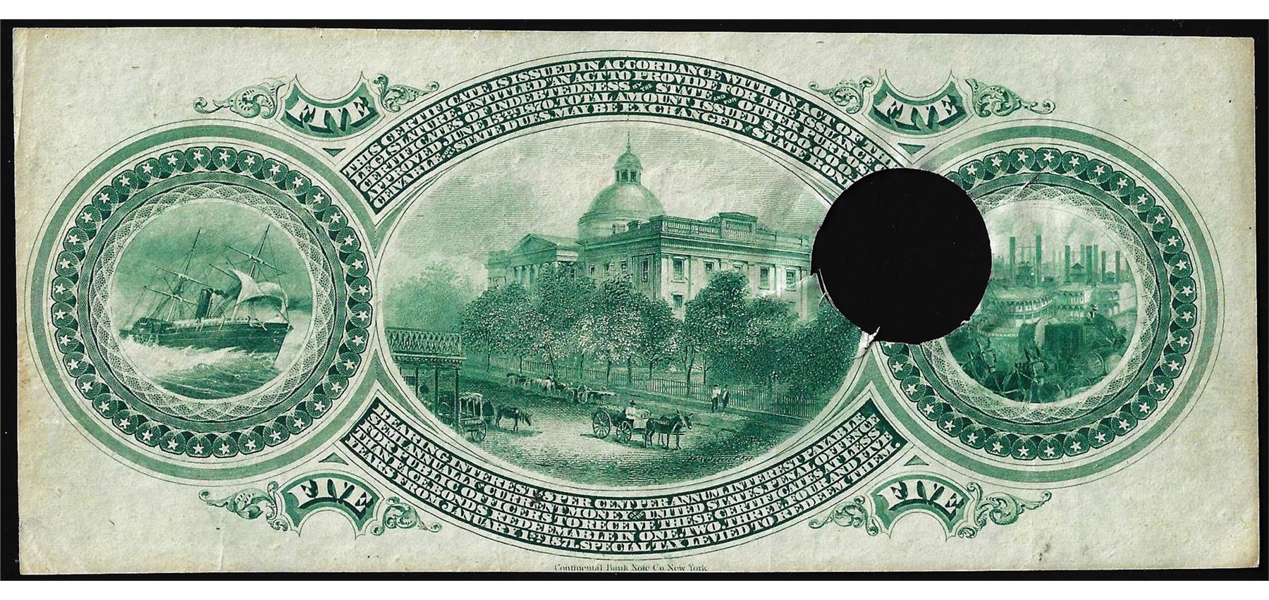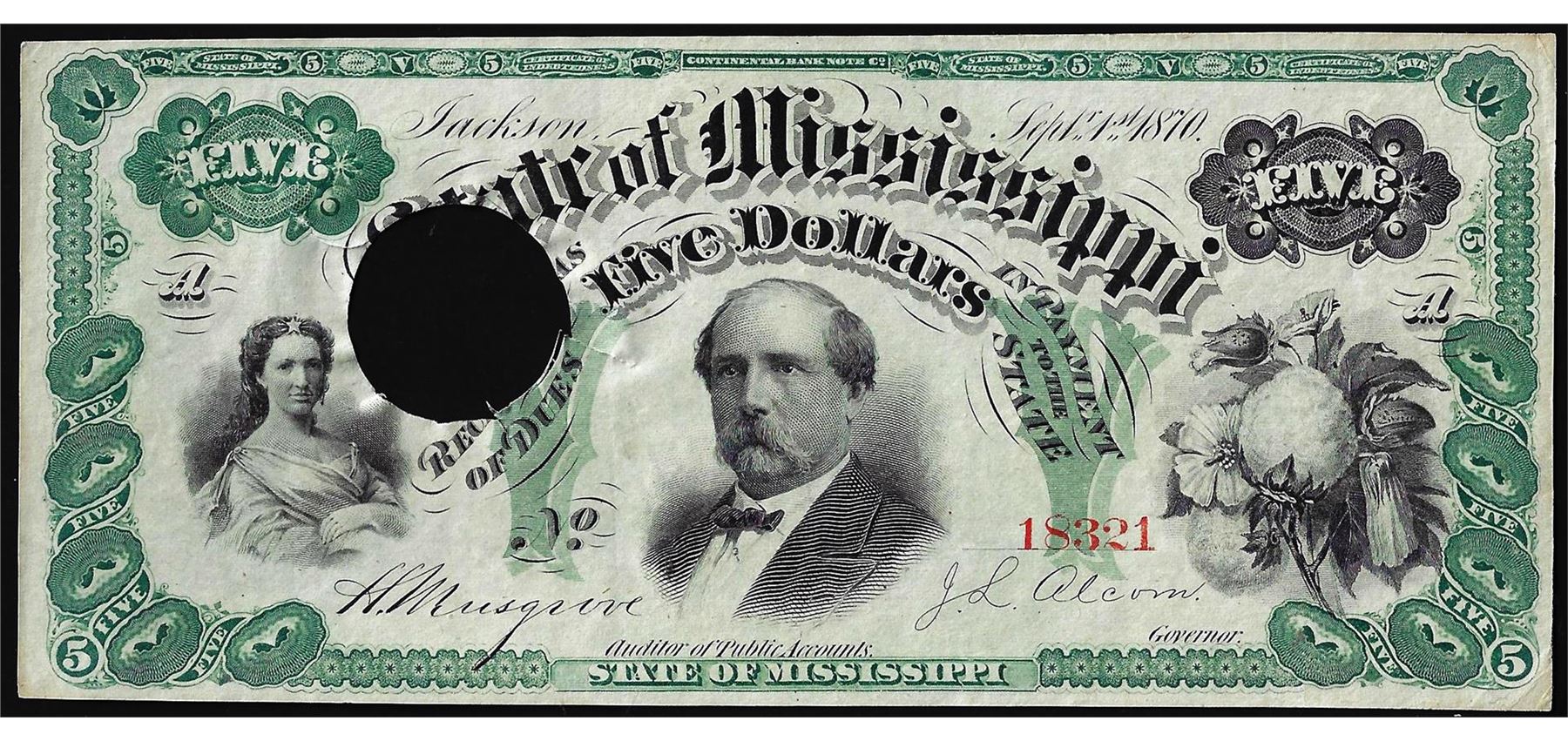 One 1870 $5 Jackson, State of Mississippi Obsolete Note.