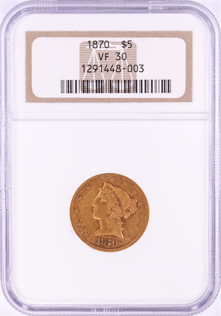One 1870 $5 Liberty Head Half Eagle Gold Coin NGC VF30. NGC Certified.