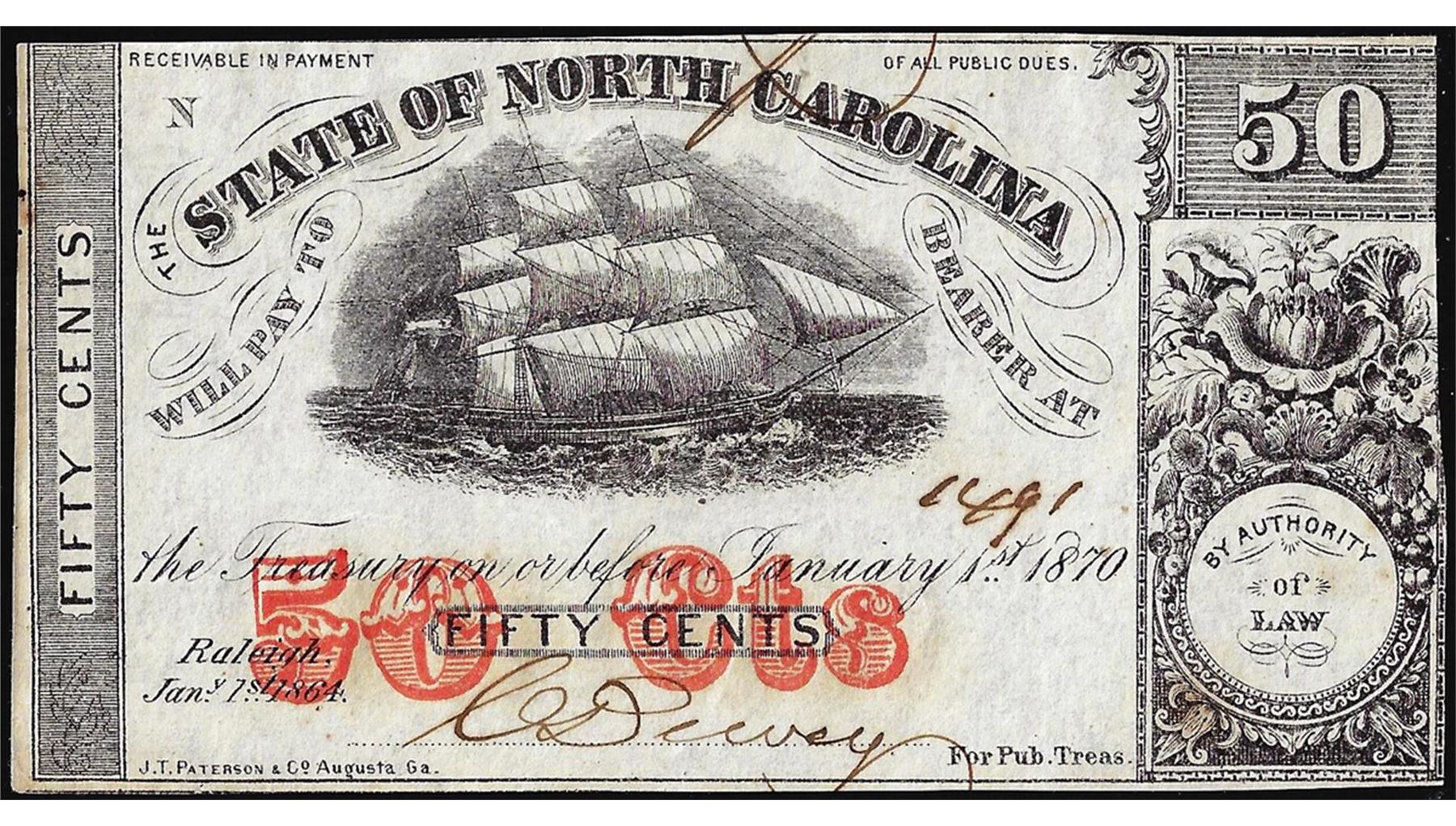 One 1870 Fifty Cents State of North Carolina Obsolete Note.