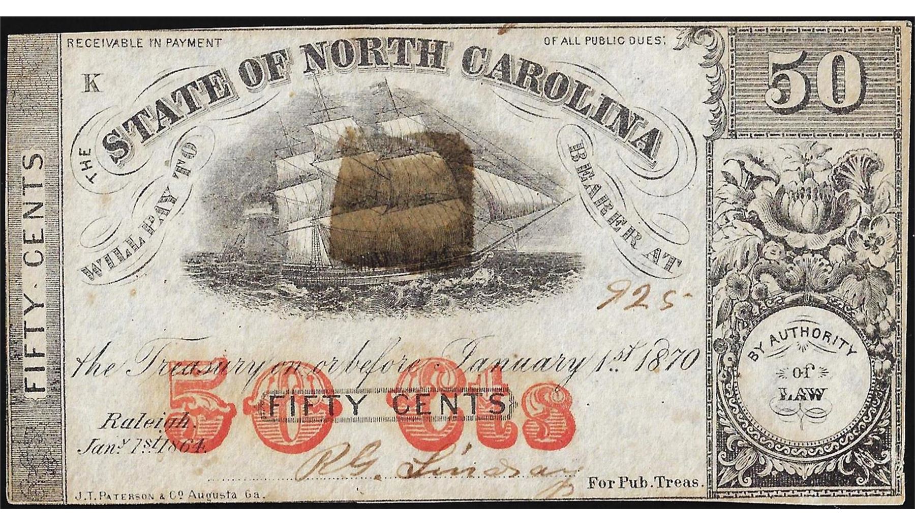 1870 Fifty Cents State of North Carolina Raleigh Obsolete Note