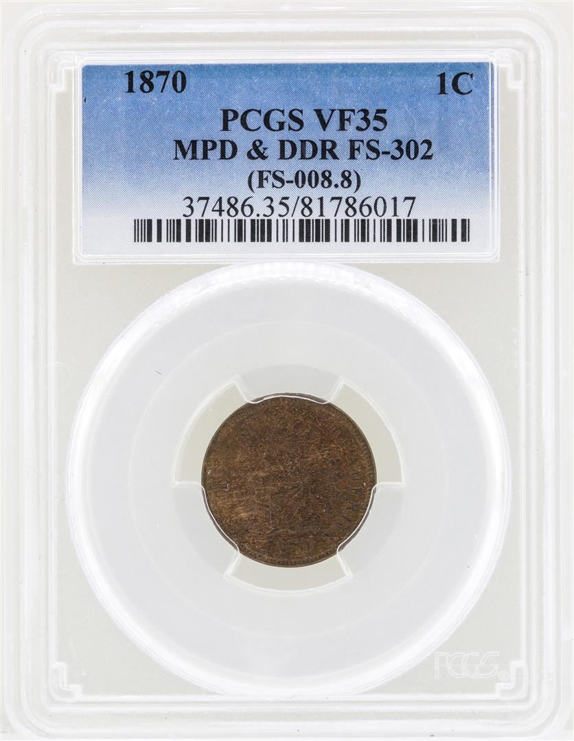 One 1870 Indian Head Penny Coin PCGS VF35 MPD & DDR FS-302. PCGS Graded.