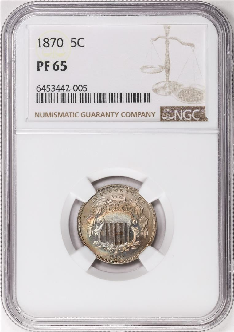 One 1870 Proof Shield Nickel Coin NGC PF65 Nice Color. NGC Certified.