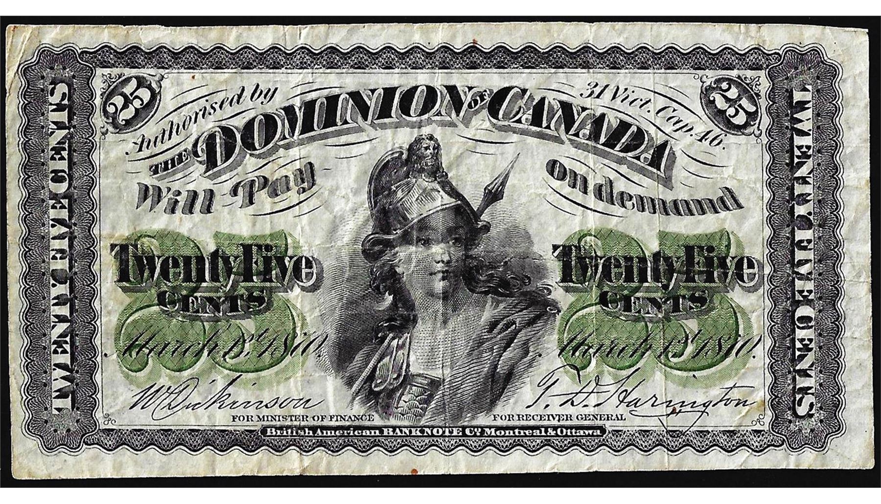 One 1870 Twenty-Five Cents Dominion of Canada Note.