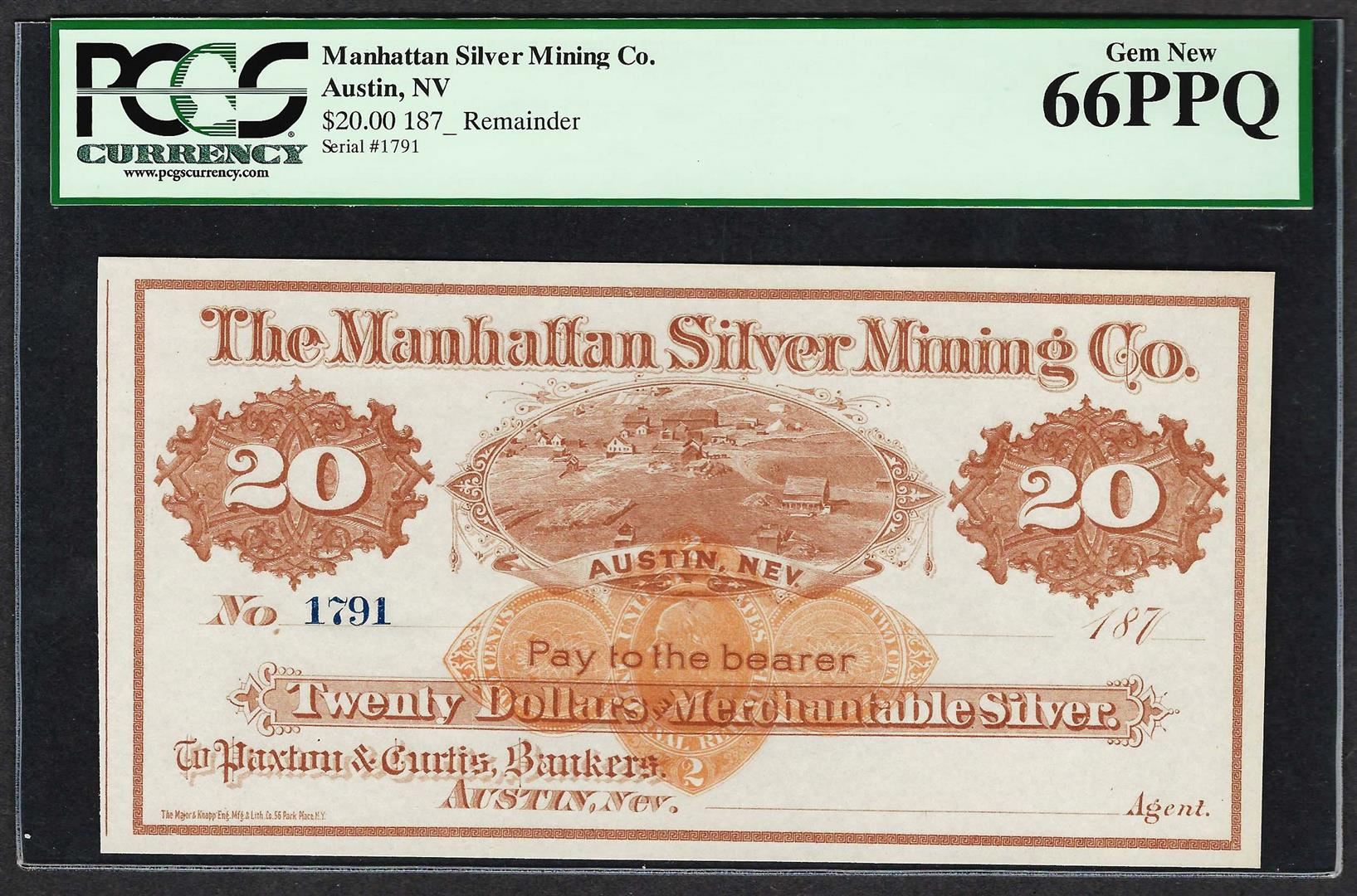 One 1870's $20 Manhattan Silver Mining Co. Obsolete Note PCGS Gem New 66PPQ. PCGS Graded.