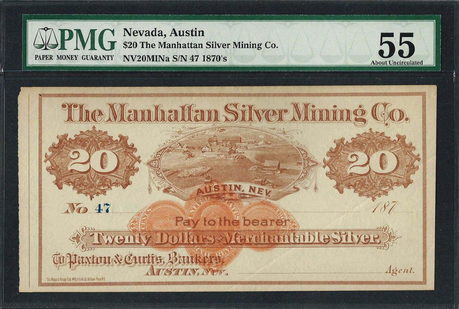One 1870's $20 The Manhattan Silver Mining Co. Obsolete Note PMG About Uncirculated 55. PMG Certified.