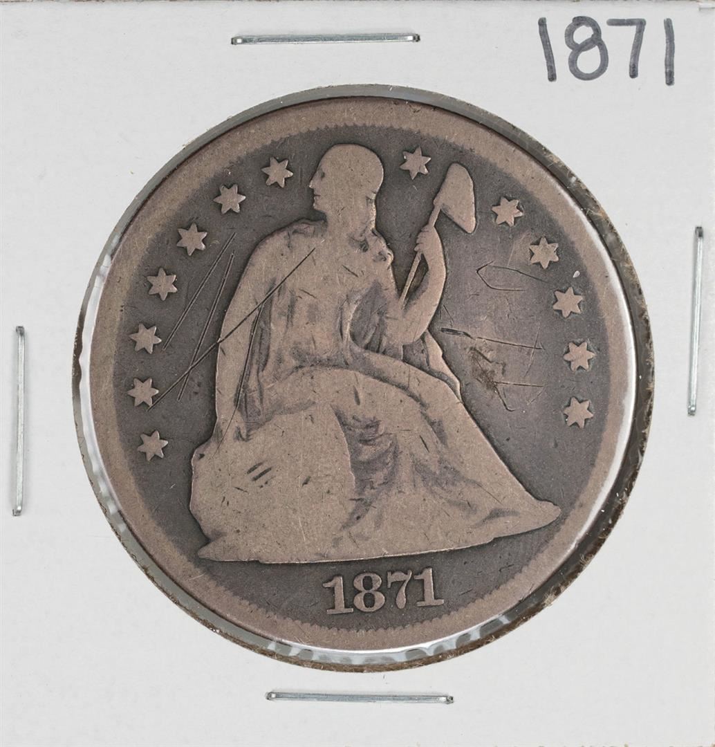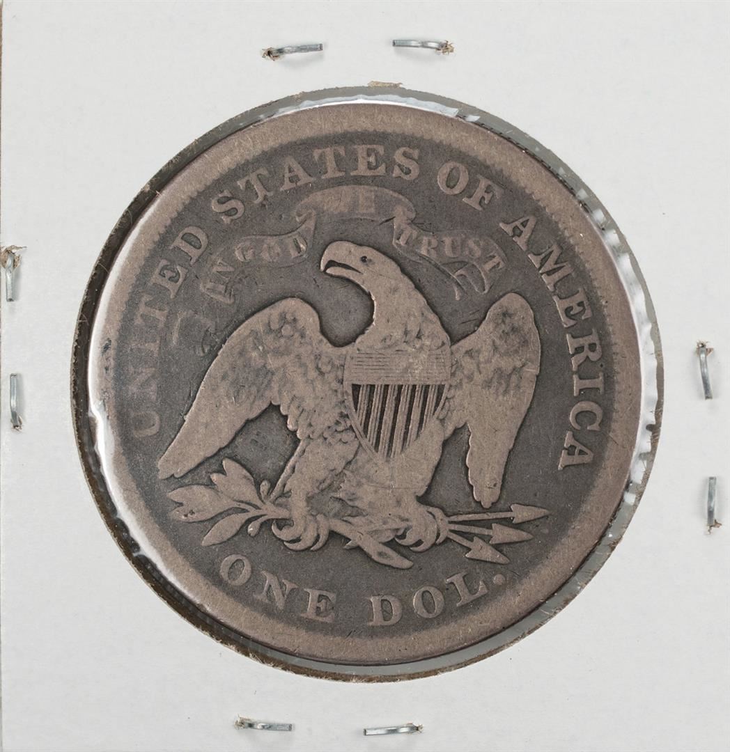 One 1871 $1 Seated Liberty Silver Dollar Coin.