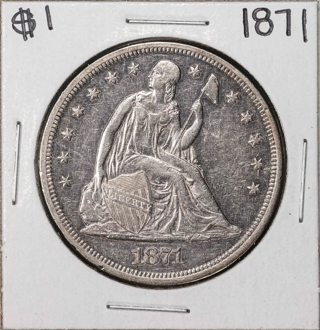 One 1871 $1 Seated Liberty Silver Dollar Coin.
