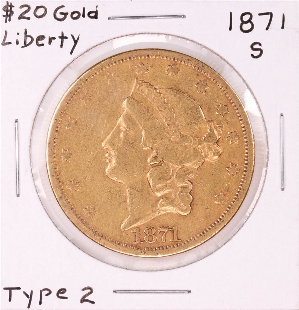 One 1871-S Type 2 $20 Liberty Head Double Eagle Gold Coin.