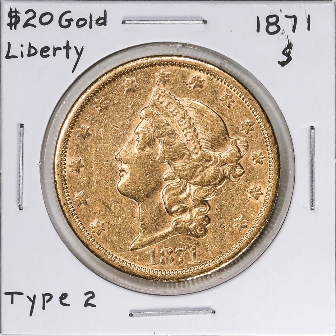 One 1871-S Type 2 $20 Liberty Head Double Eagle Gold Coin.