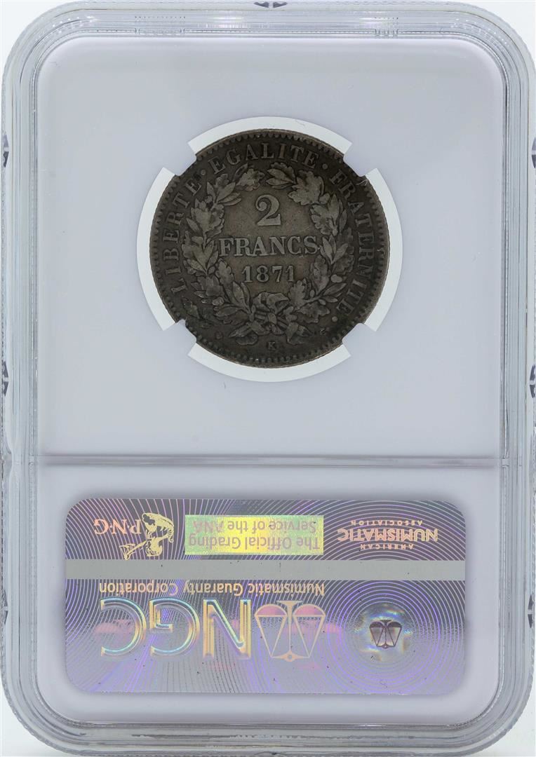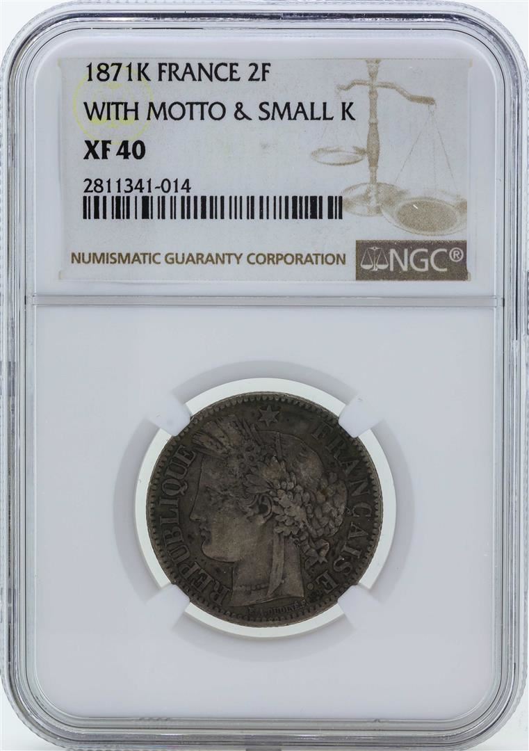 One 1871K France 2 Francs Silver Coin with Motto & Small K NGC XF40. NGC Certified.