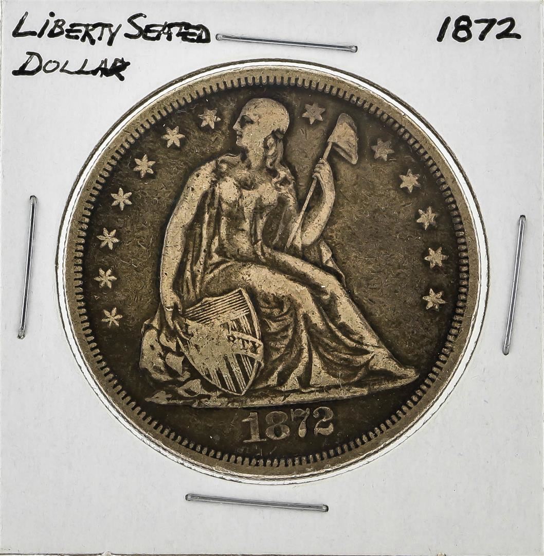 One 1872 $1 Liberty Seated Dollar Silver Coin.
