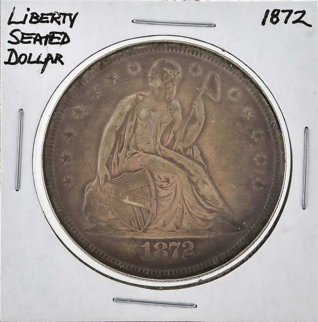 One 1872 $1 Liberty Seated Silver Dollar Coin.