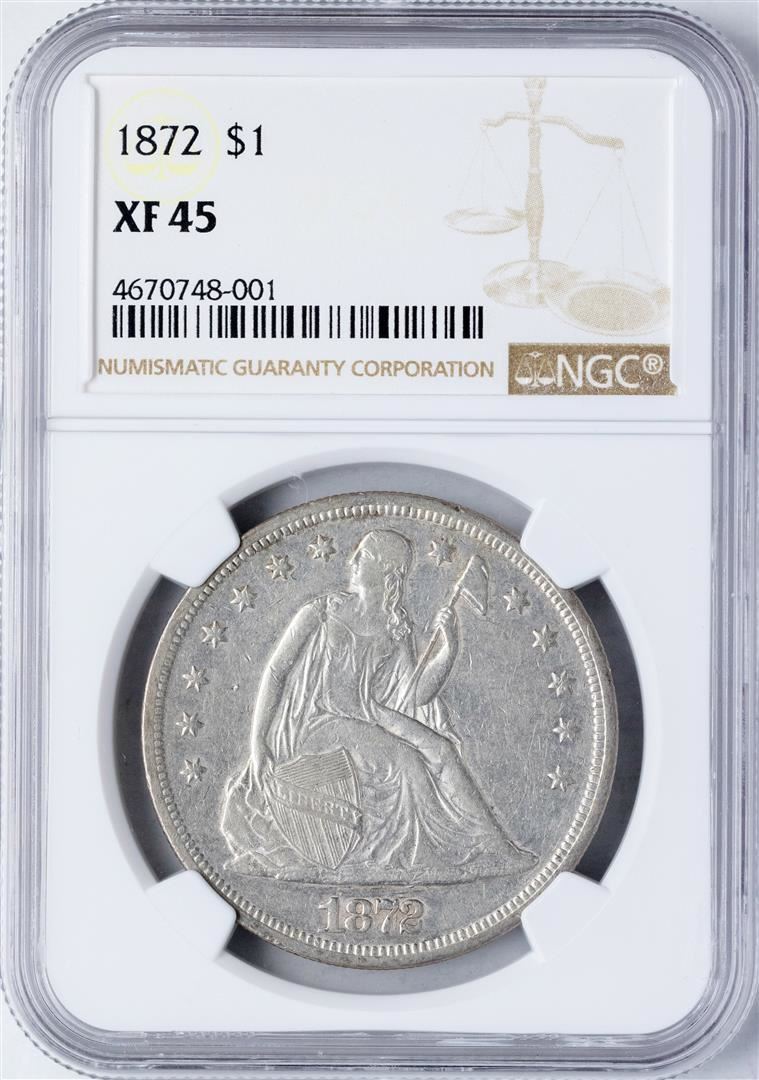 One 1872 $1 Seated Liberty Silver Dollar Coin NGC XF45. NGC Certified.