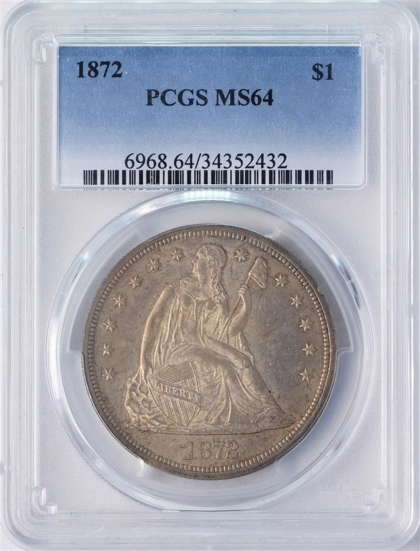 One 1872 $1 Seated Liberty Silver Dollar Coin PCGS MS64. PCGS Graded.