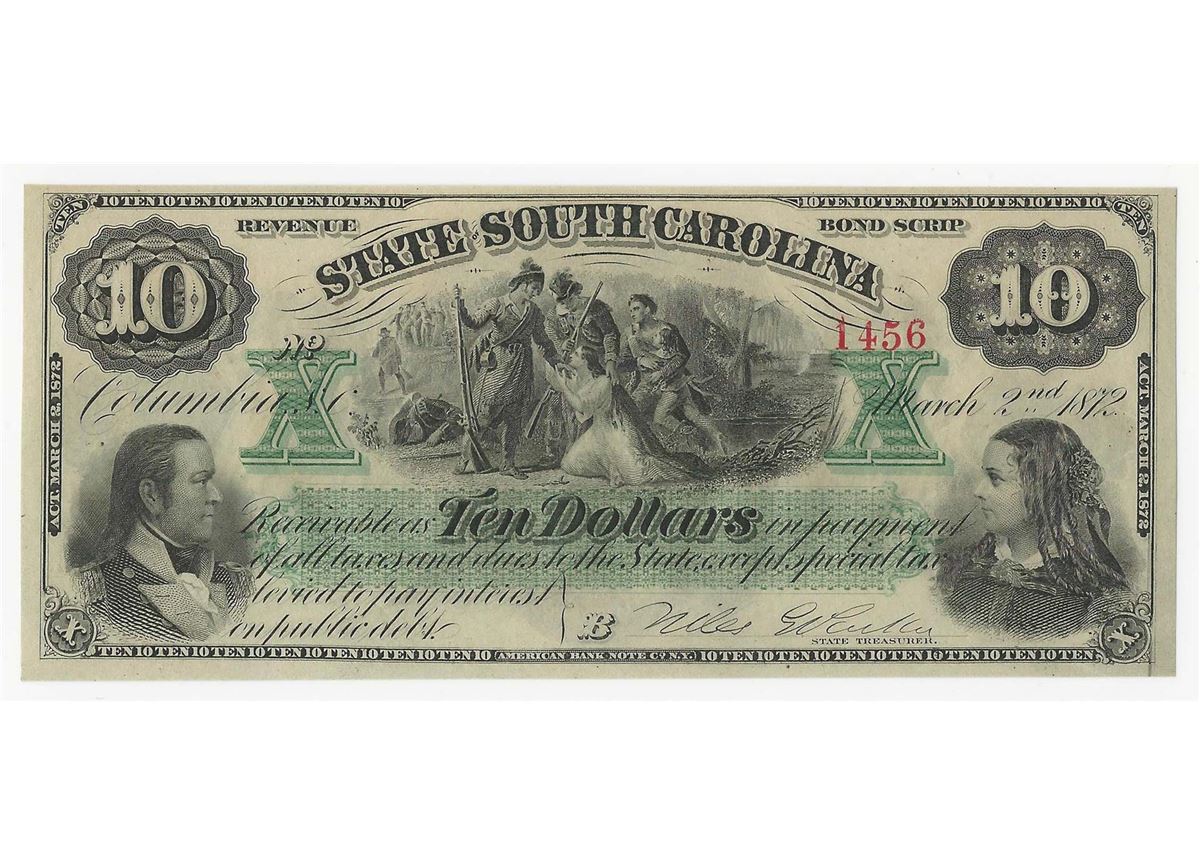 One 1872 $10 State of South Carolina Bond Scrip.