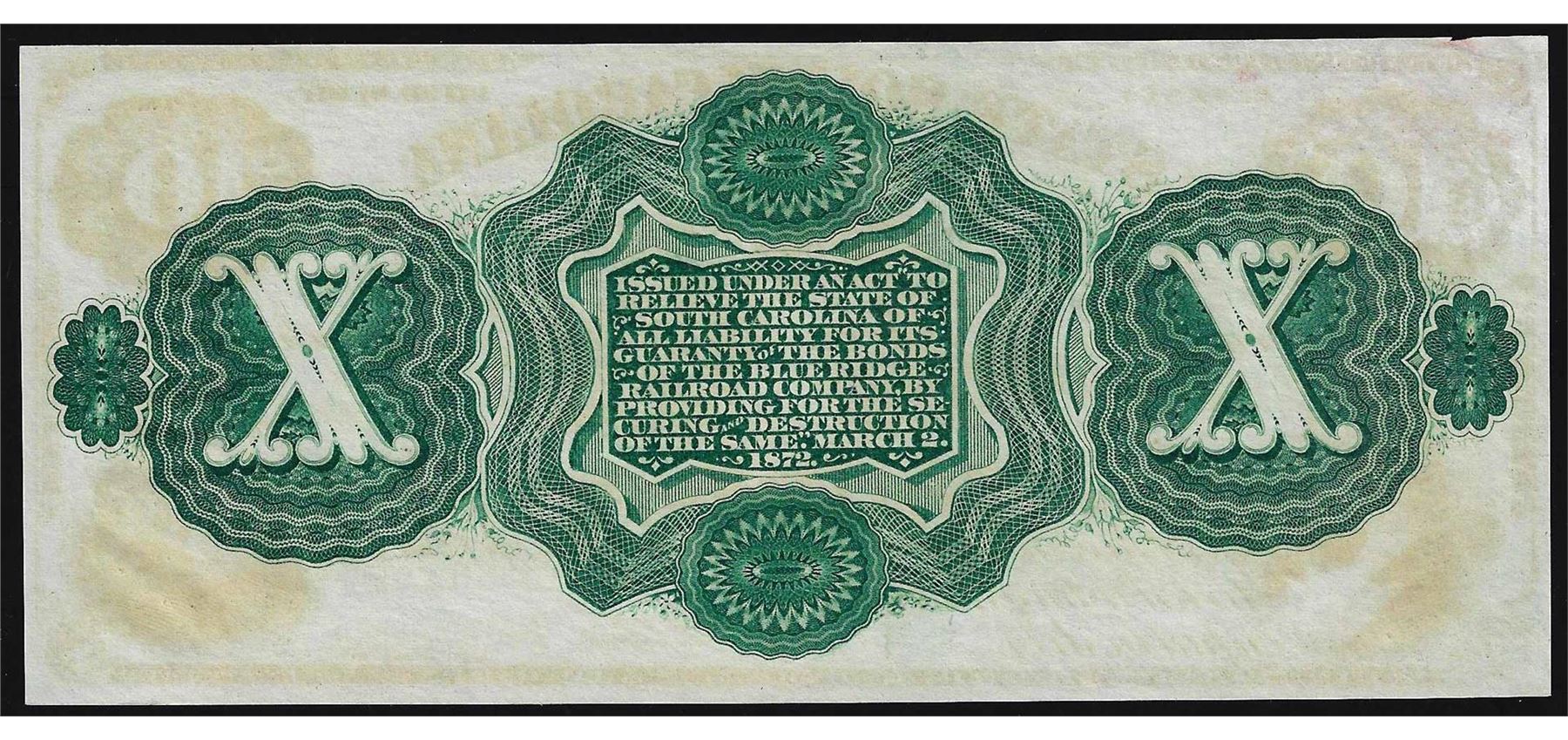 One 1872 $10 State of South Carolina Revenue Bond Scrip.