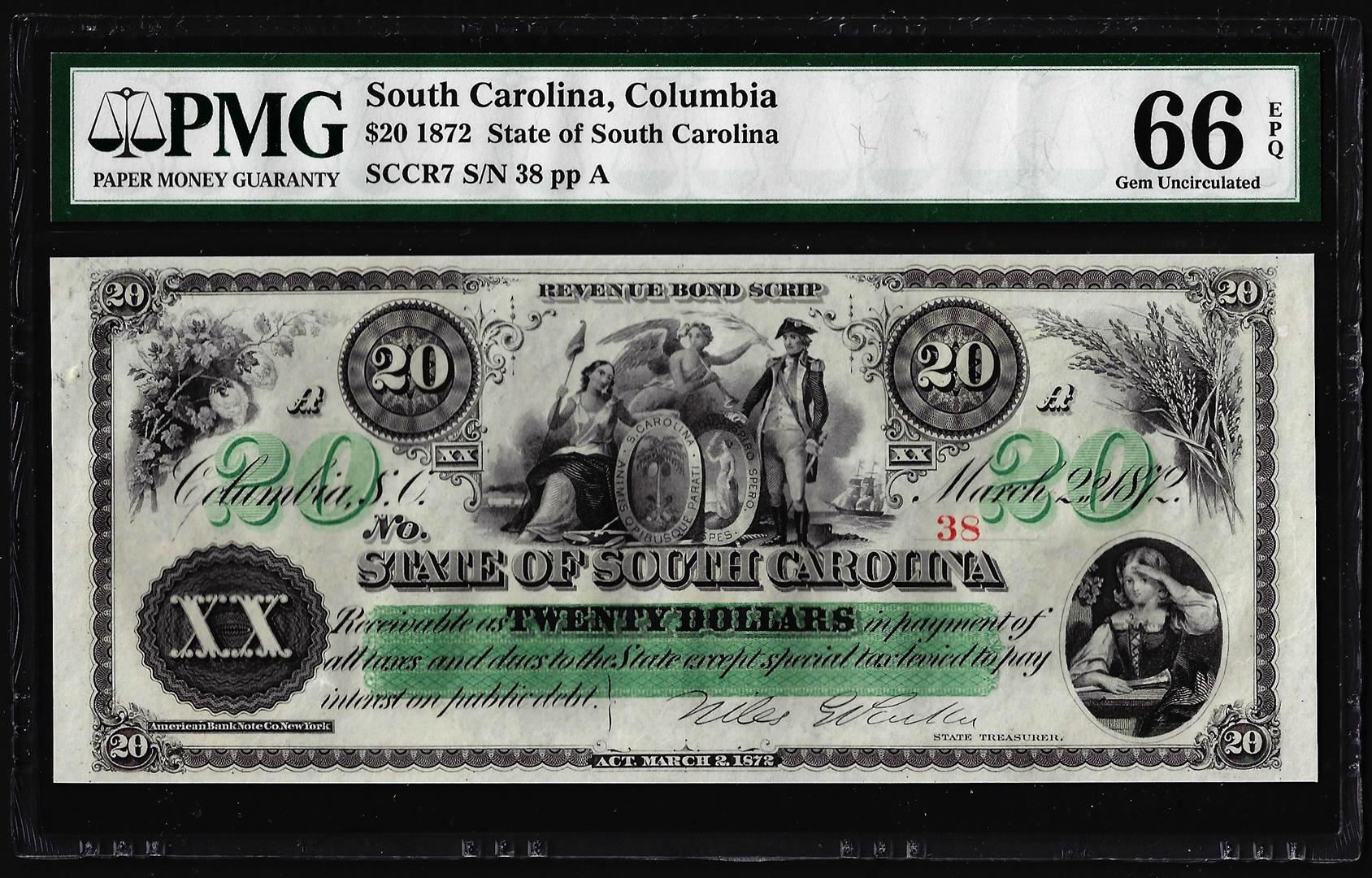 1872 $20 State of South Carolina Obsolete Note PMG Gem Unc. 66EPQ Low Serial Number