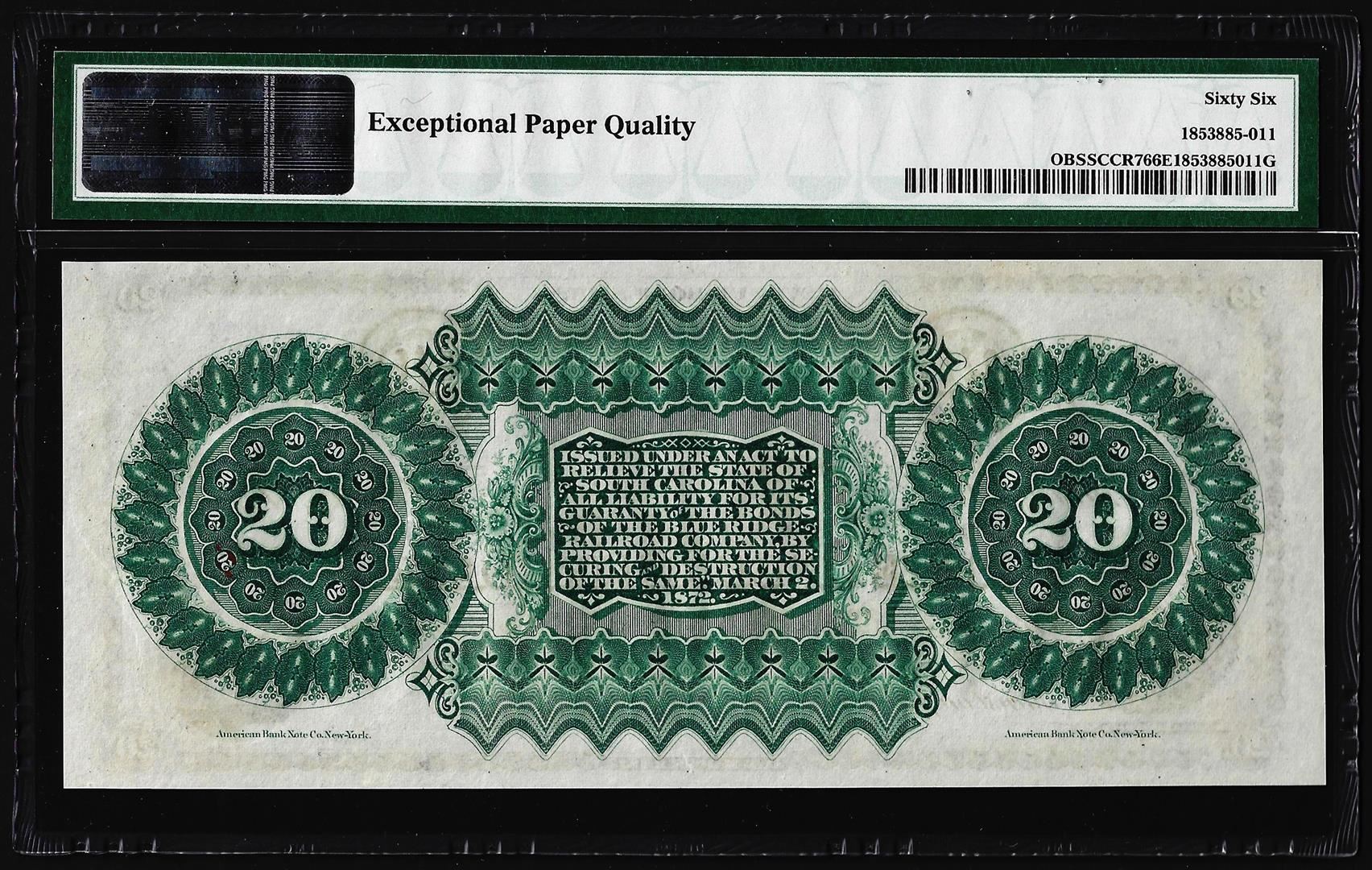 1872 $20 State of South Carolina Obsolete Note PMG Gem Unc. 66EPQ Low Serial Number