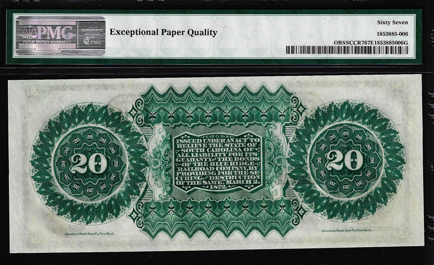1872 $20 State of South Carolina Obsolete Note PMG Gem Unc. 67EPQ Low Serial Number