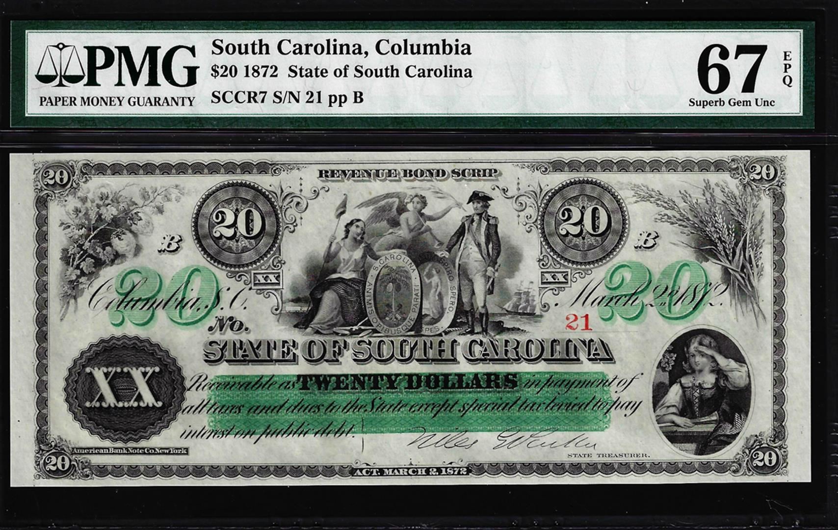 1872 $20 State of South Carolina Obsolete Note PMG Gem Unc. 67EPQ Low Serial Number