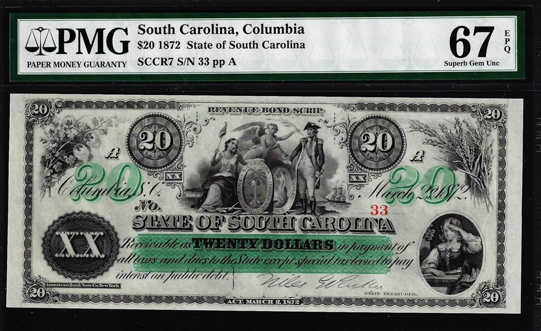 1872 $20 State of South Carolina Obsolete Note PMG Gem Unc. 67EPQ Low Serial Number