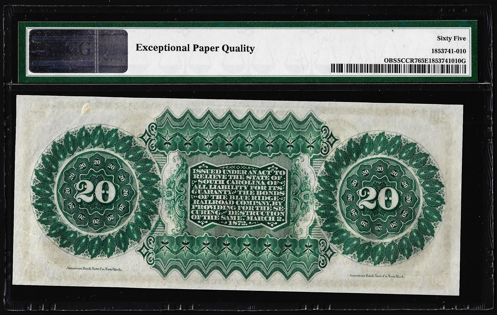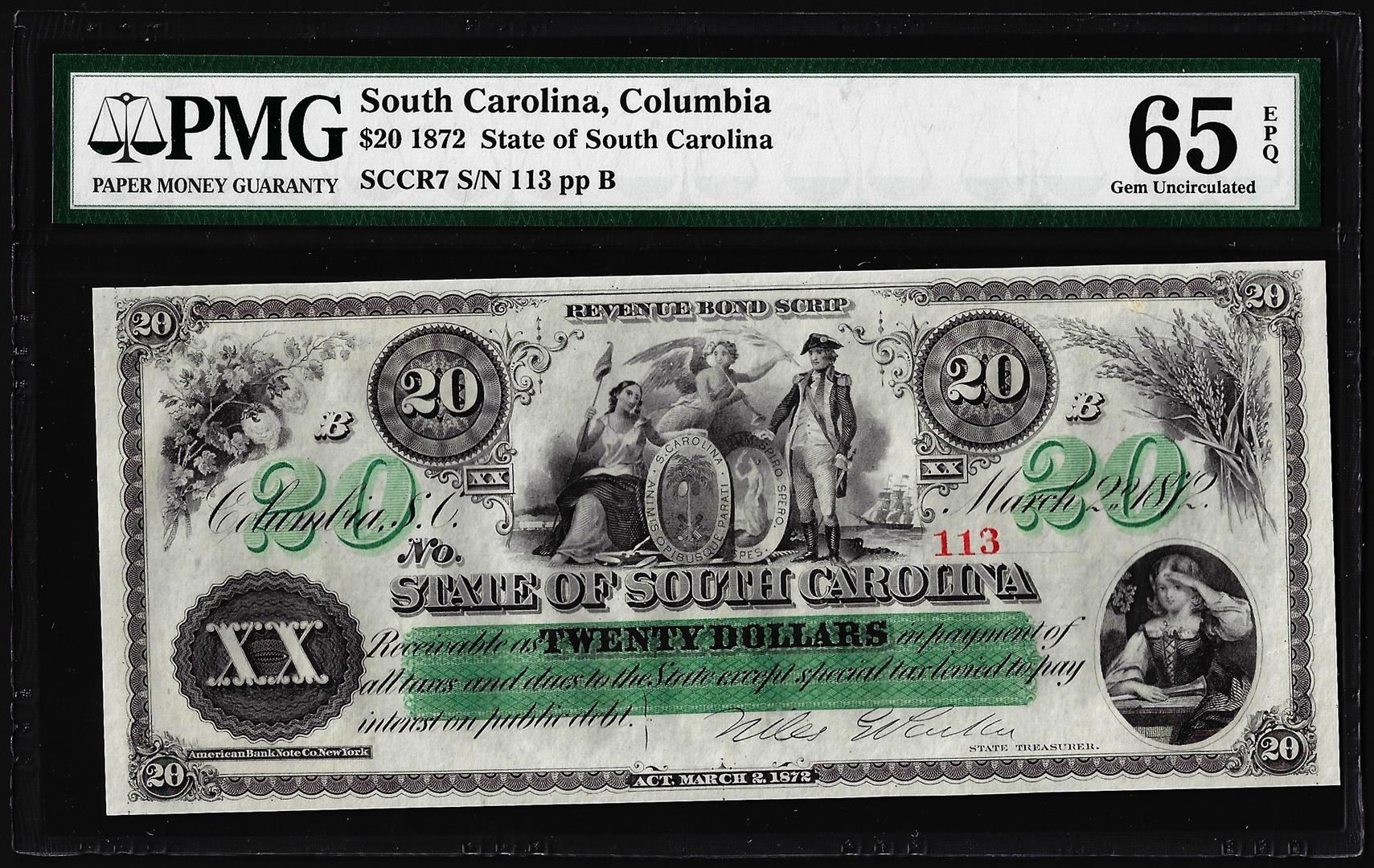 One 1872 $20 State of South Carolina Obsolete Note PMG Gem Uncirculated 65EPQ. PMG Certified.