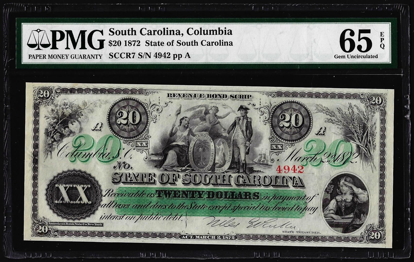 One 1872 $20 State of South Carolina Obsolete Note PMG Gem Uncirculated 65EPQ. PMG Certified.