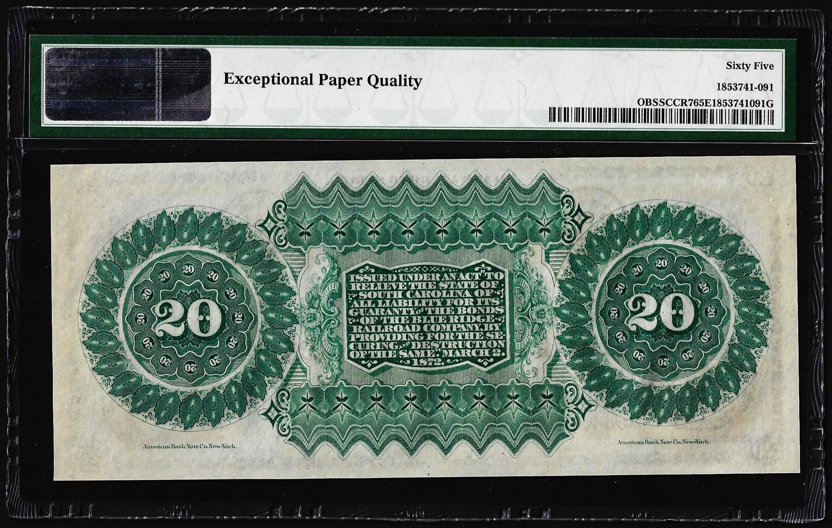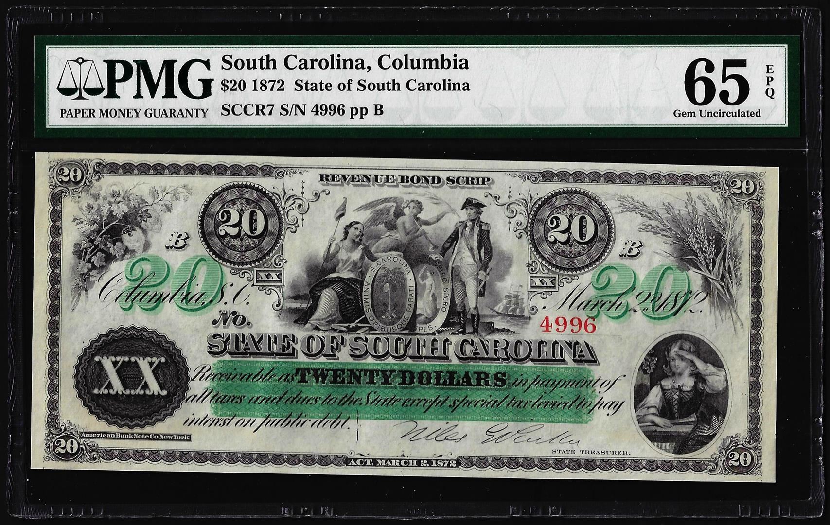 One 1872 $20 State of South Carolina Obsolete Note PMG Gem Uncirculated 65EPQ. PMG Certified.