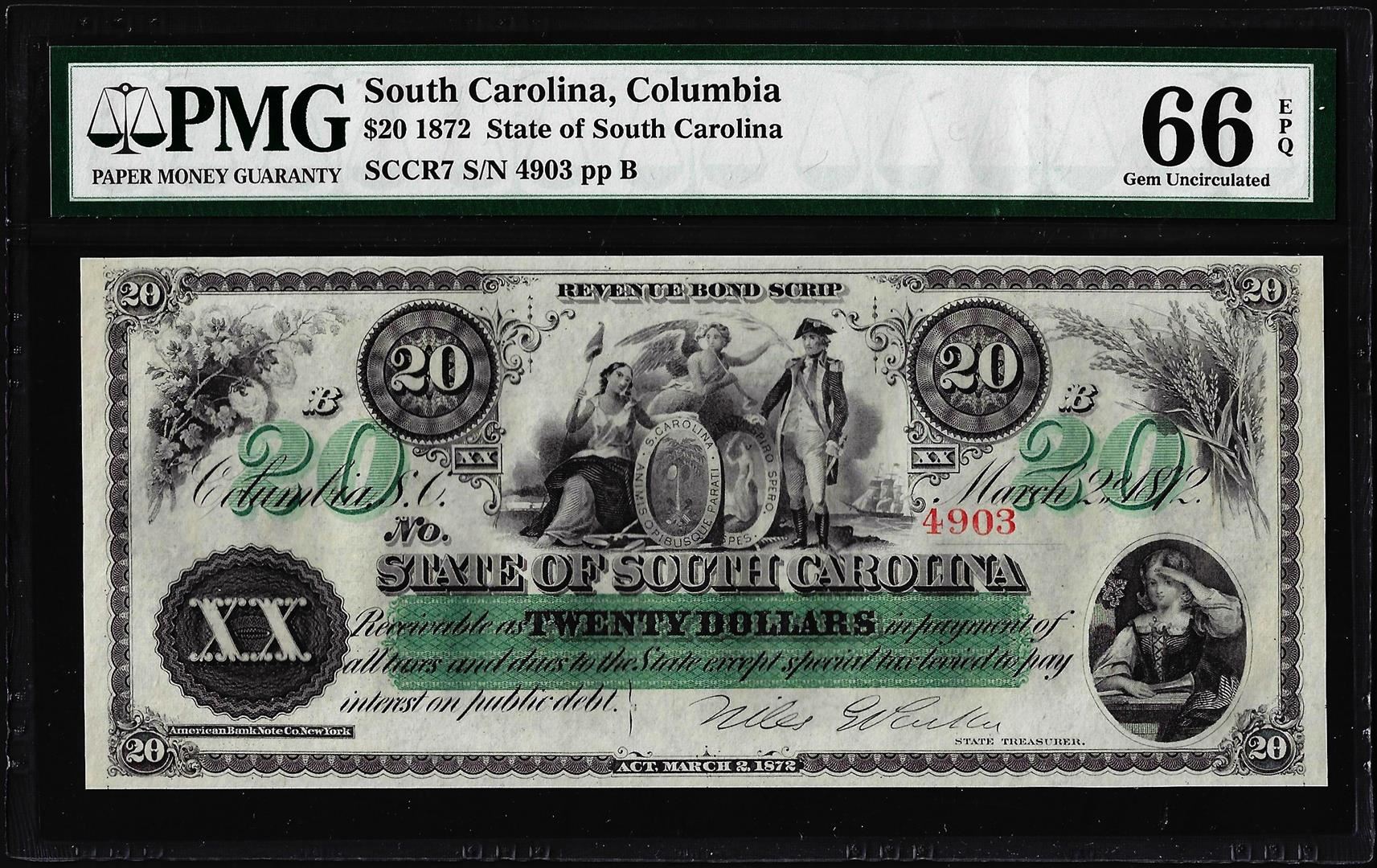One 1872 $20 State of South Carolina Obsolete Note PMG Gem Uncirculated 66EPQ. PMG Certified.