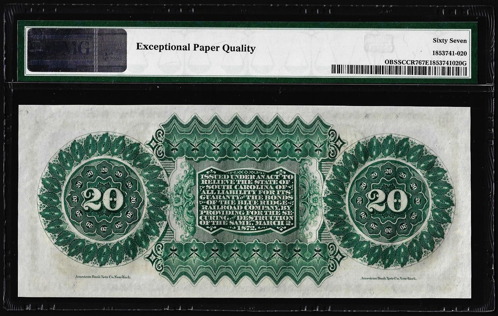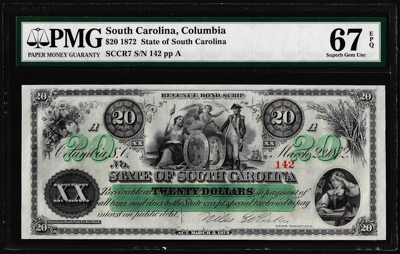 One 1872 $20 State of South Carolina Obsolete Note PMG Superb Gem Unc 67EPQ. PMG Certified.