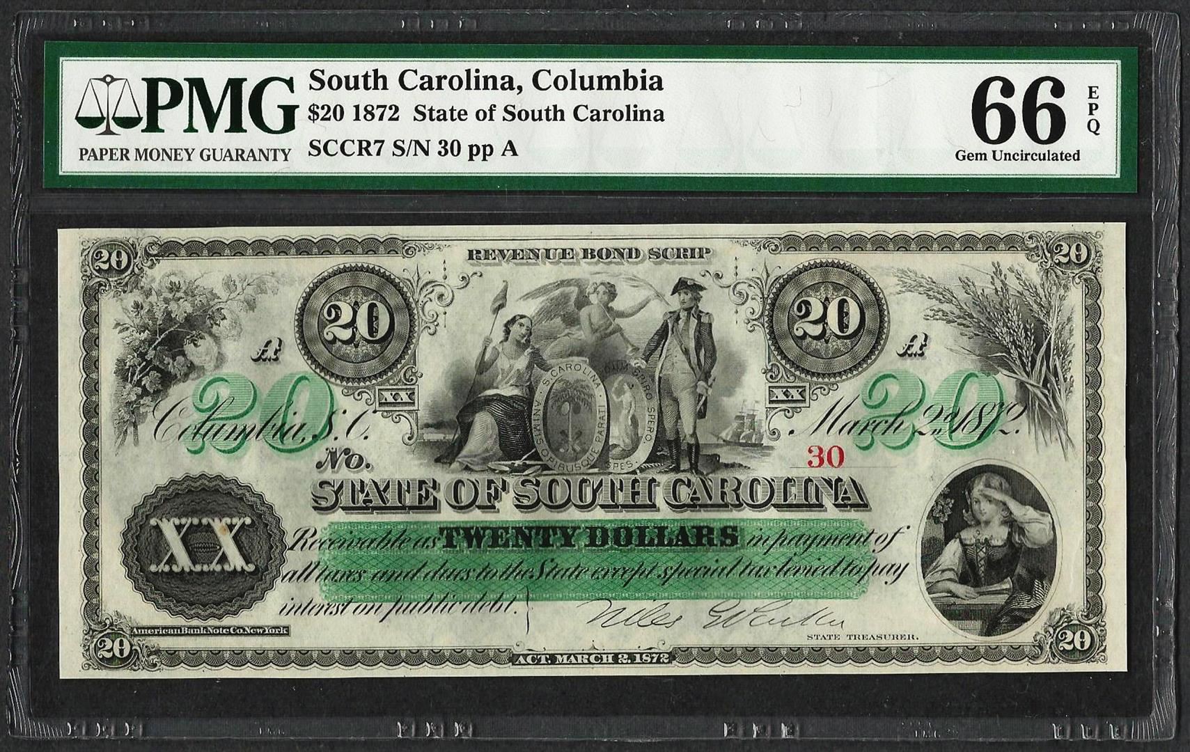 1872 $20 State of South Carolina Revenue Bond Obsolete Note PMG Gem Uncirculated 66EPQ