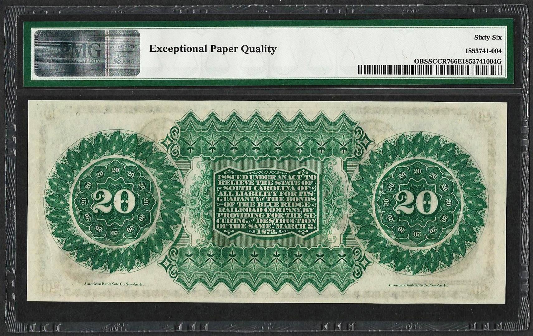 1872 $20 State of South Carolina Revenue Bond Obsolete Note PMG Gem Uncirculated 66EPQ