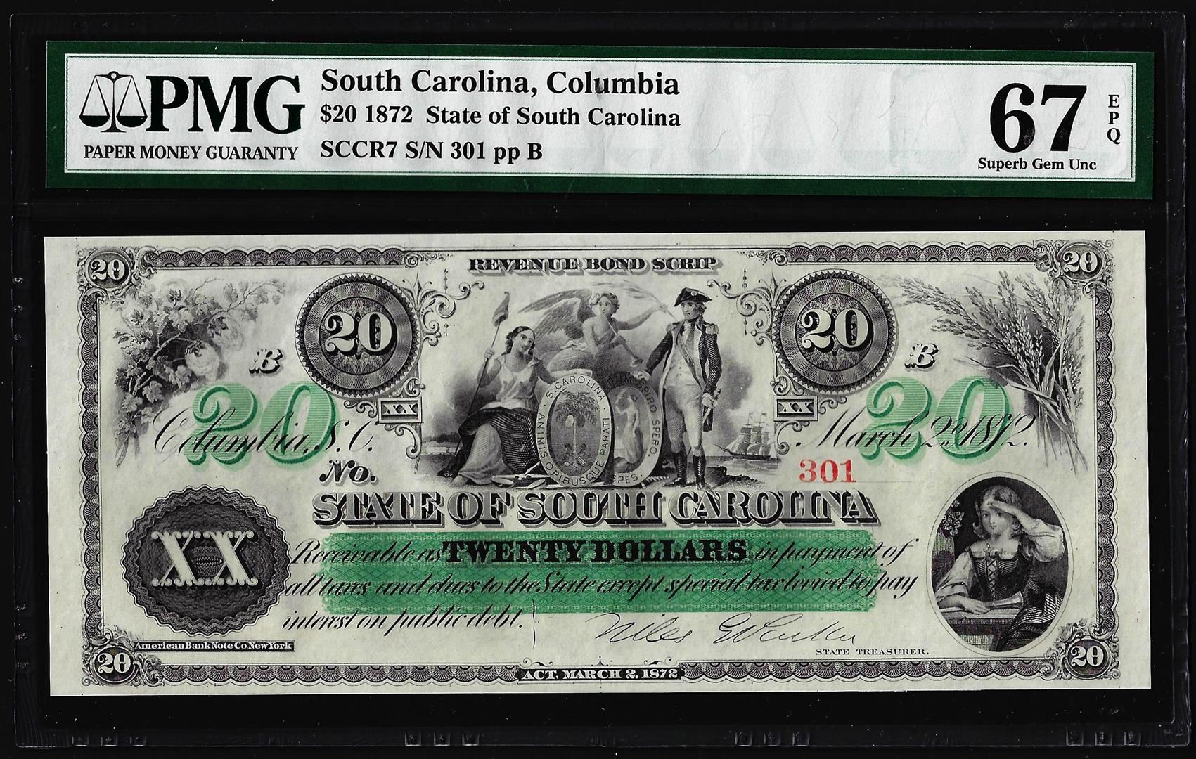 One 1872 $20 State of South Carolina Revenue Bond Obsolete Note PMG Superb Gem Uncirculated 67EPQ. PMG Certified.