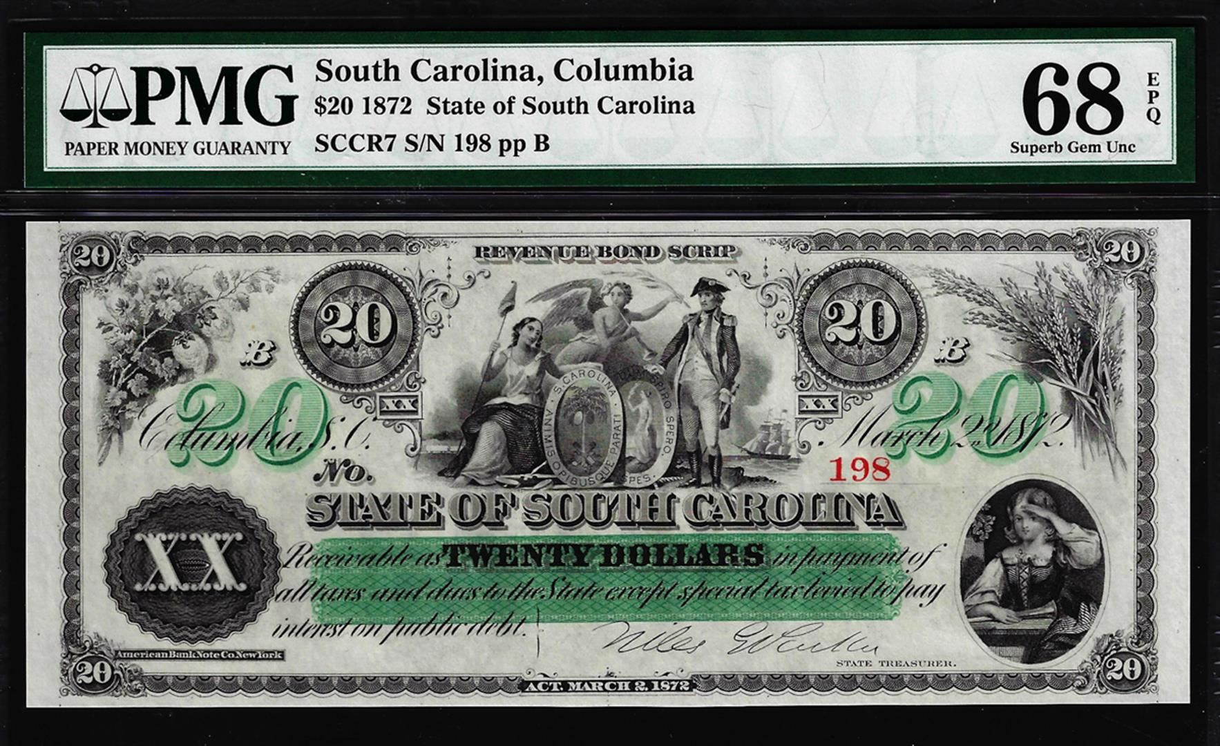 One 1872 $20 State of South Carolina Revenue Bond Obsolete Note PMG Superb Gem Unc. 68EPQ. PMG Certified.