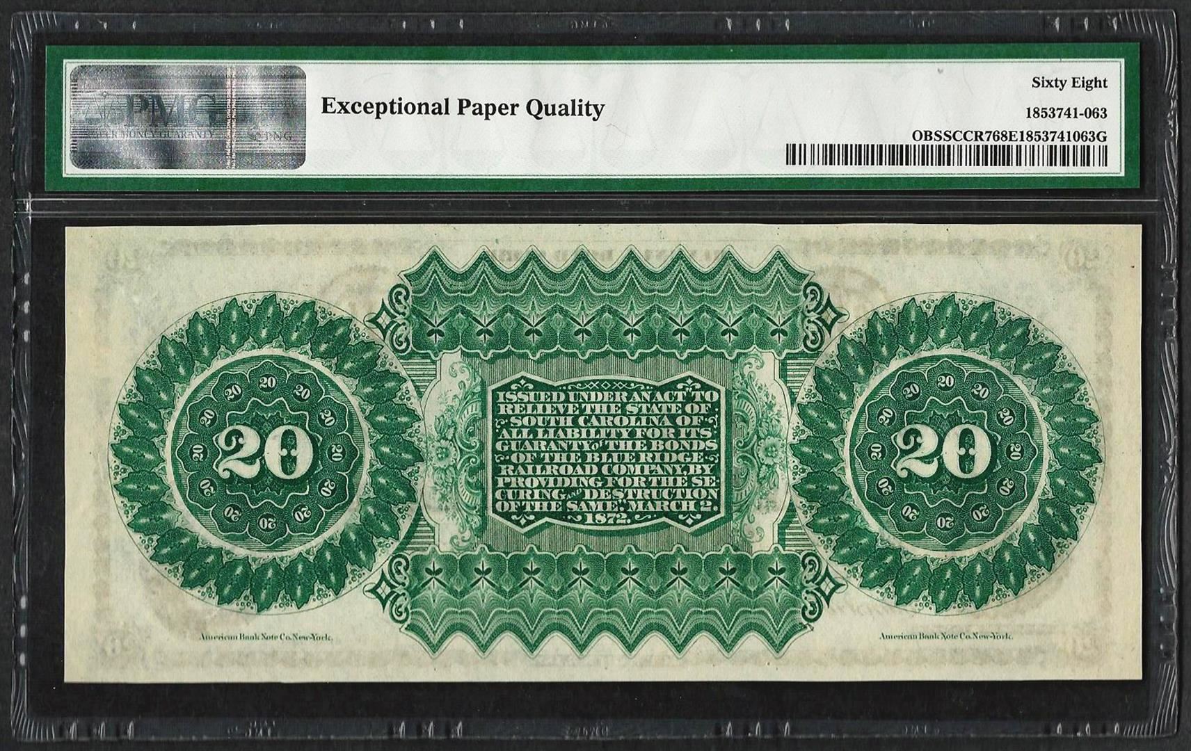 1872 $20 State of South Carolina Revenue Bond Obsolete Note PMG Superb Gem Unc. 68EPQ