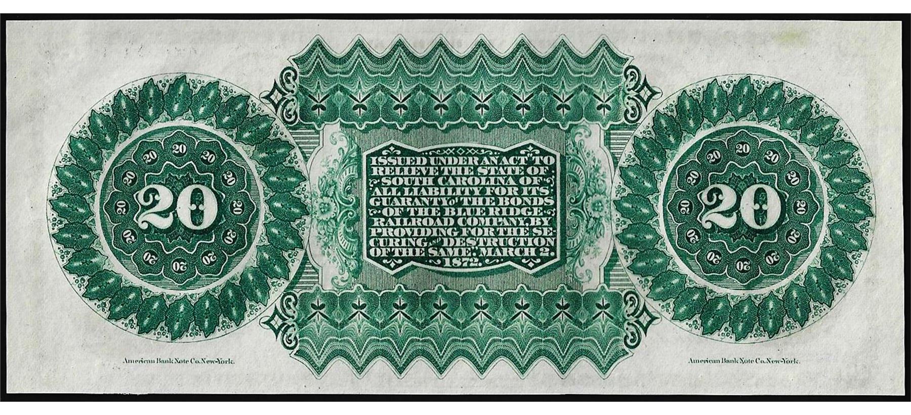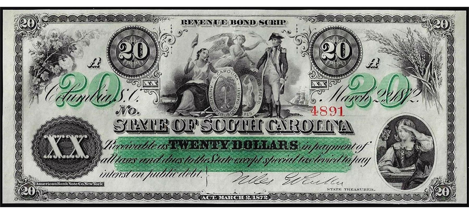 One 1872 $20 State of South Carolina Revenue Bond Obsolete Note.
