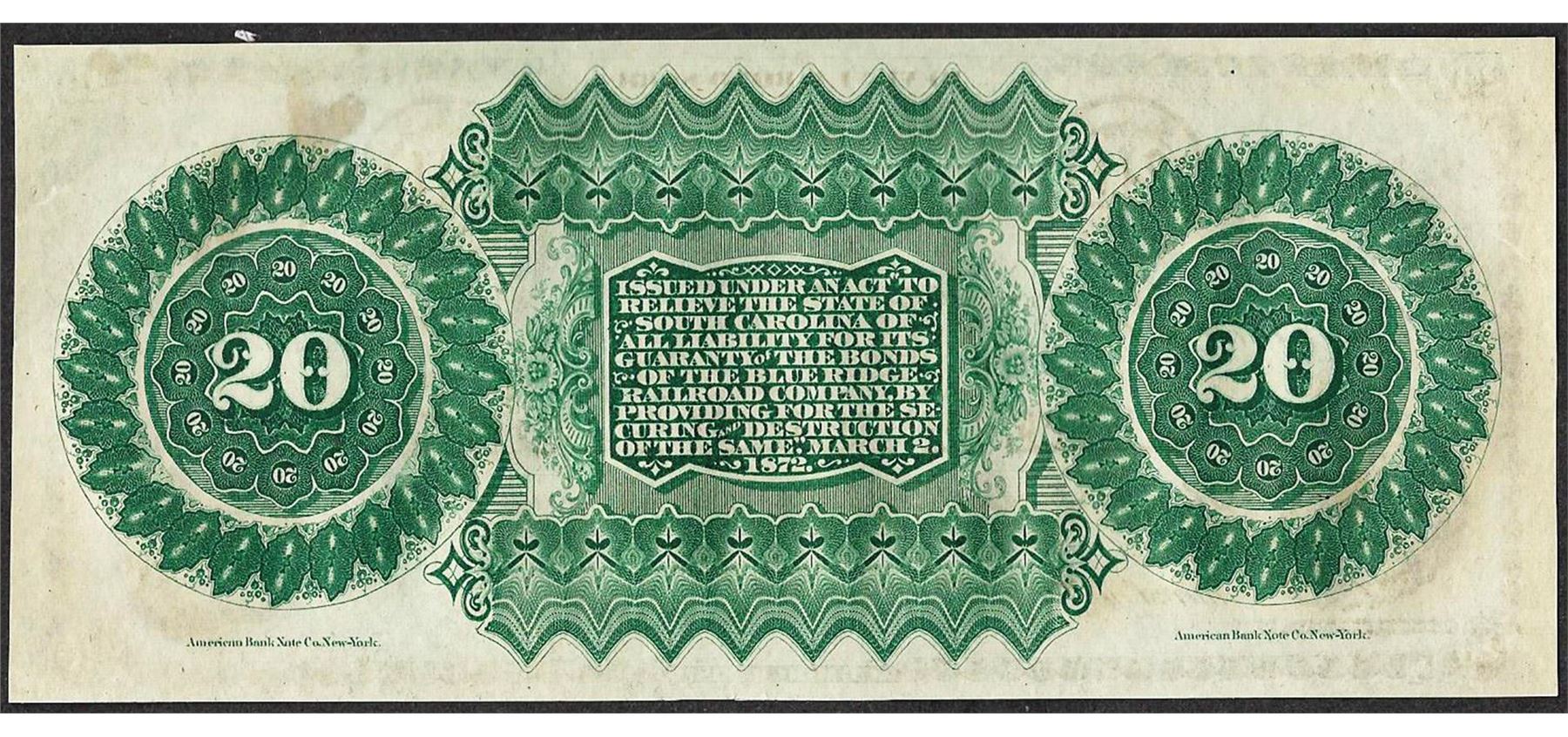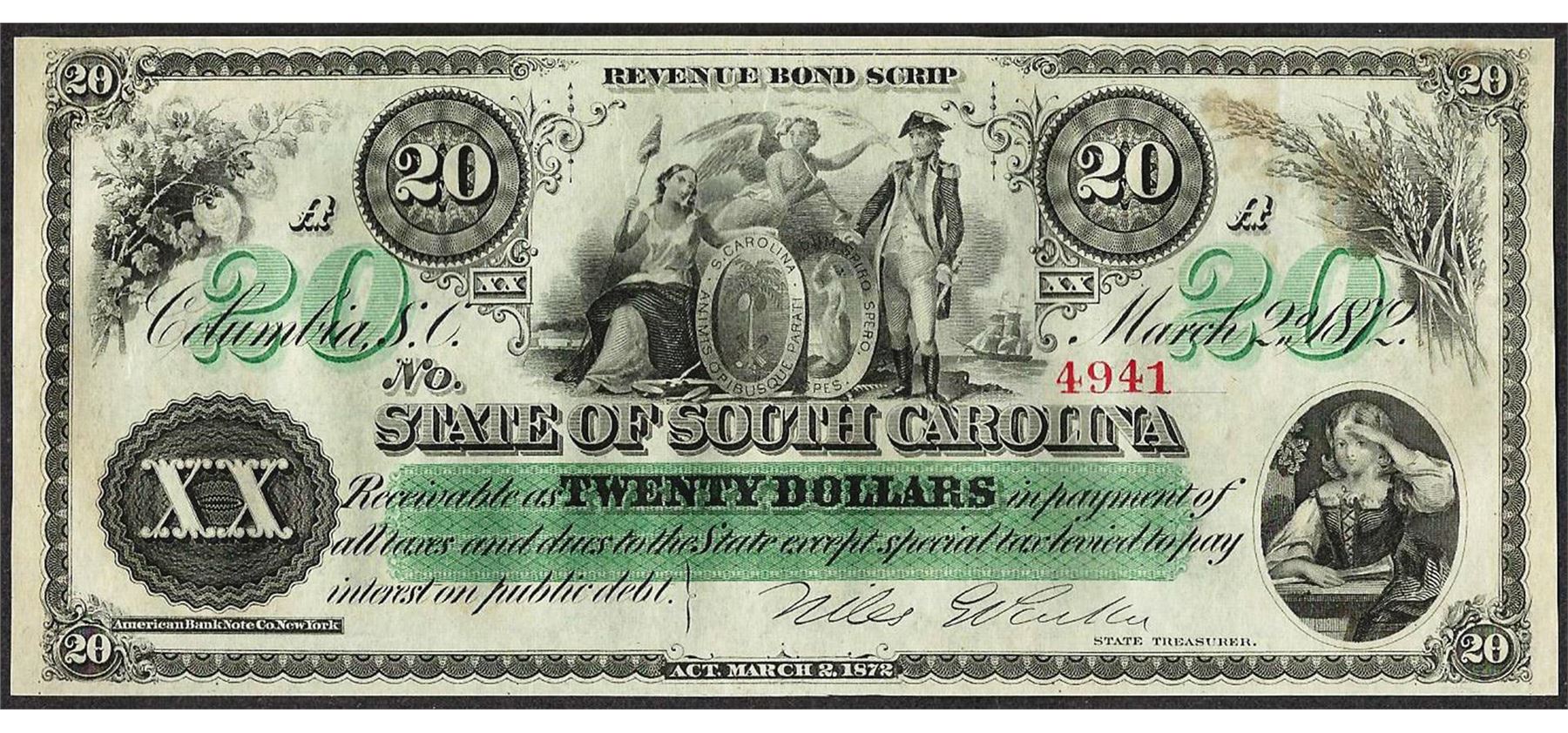 One 1872 $20 State of South Carolina Revenue Bond Obsolete Note.